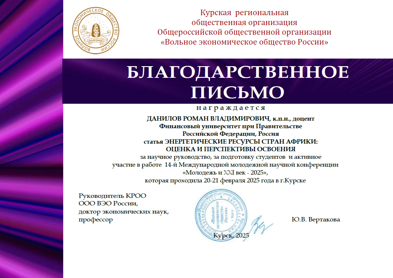 Благодарственное письмо стало признанием не только профессионального мастерства Романа Владимировича, но и его вклада в развитие научного потенциала студентов. Кафедра международного бизнеса поздравляет Романа Владимировича с этой заслуженной наградой и желает дальнейших успехов в научной и педагогической деятельности!