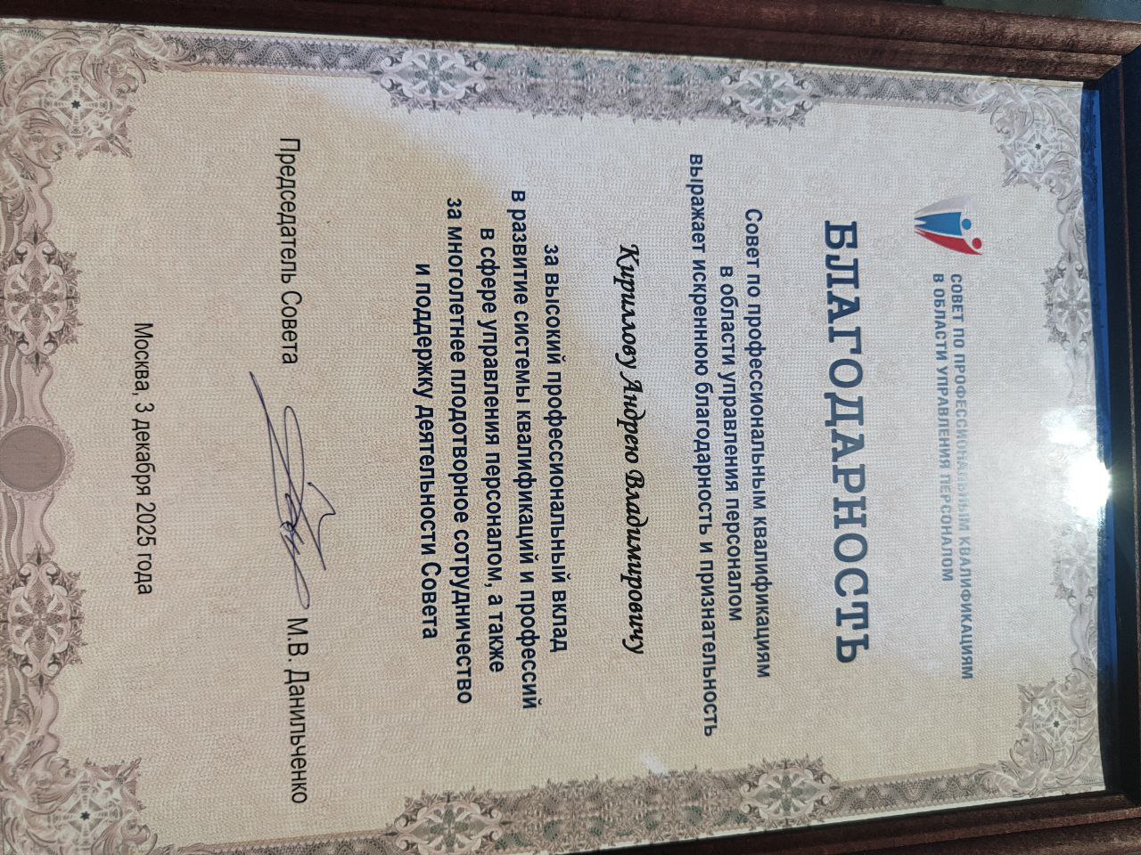 3 декабря 2025 года в рамках Всероссийского кадрового форума на ВДНХ заместитель проректора по дополнительному профессиональному образованию Финансового университета Андрей Владимирович Кириллов был отмечен благодарностью Совета по профессиональным квалификациям в области управления персоналом. Благодарность вручила председатель Совета Марина Владимировна Данильченко за высокий профессиональный вклад в развитие системы квалификаций и профессий в сфере управления персоналом, а также за многолетнее плодотворное сотрудничество и поддержку деятельности Совета.