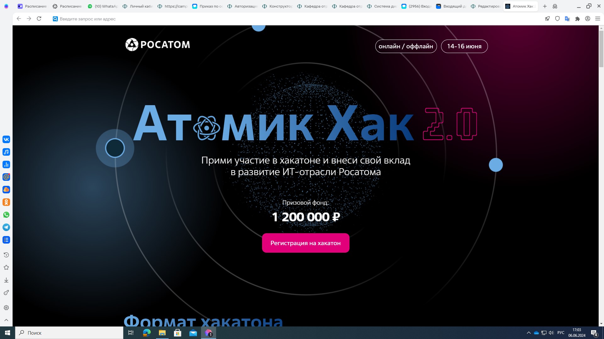 14-16 июня 2024 г. состоится Хакатон Aтомик Хак 2.0 в гибридном формате. Приглашаются все заинтересованные к участию. Подробнее о мероприятии по ссылке.