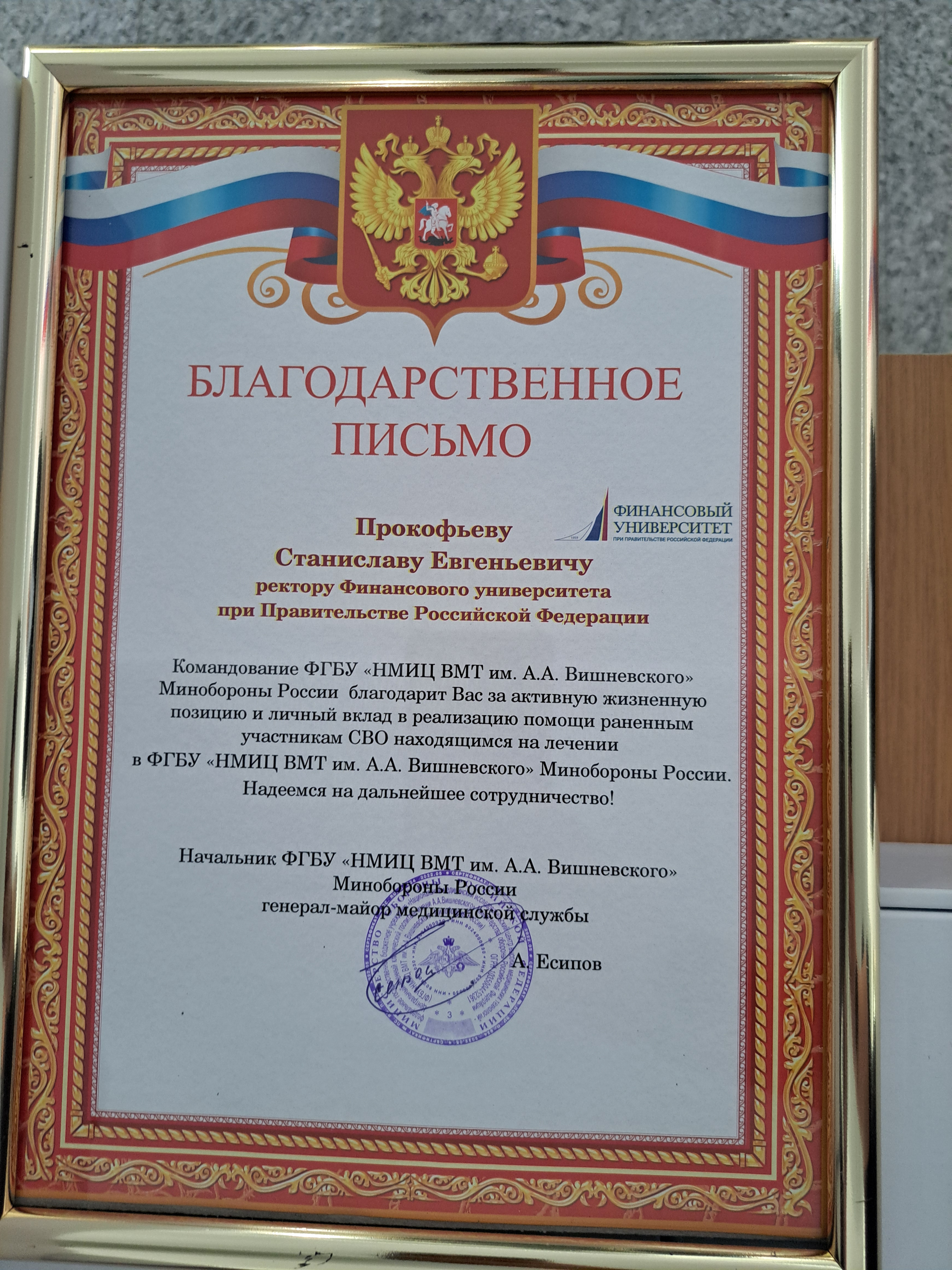 19 февраля 2024 года представители руководства Финансового университета посетили торжественную церемонию награждения участников спецоперации в госпитале имени А.А. Вишневского. Заместитель министра обороны Татьяна Шевцова вручила государственные награды военнослужащим, поблагодарив их за верность воинскому долгу и пожелав скорейшего выздоровления.