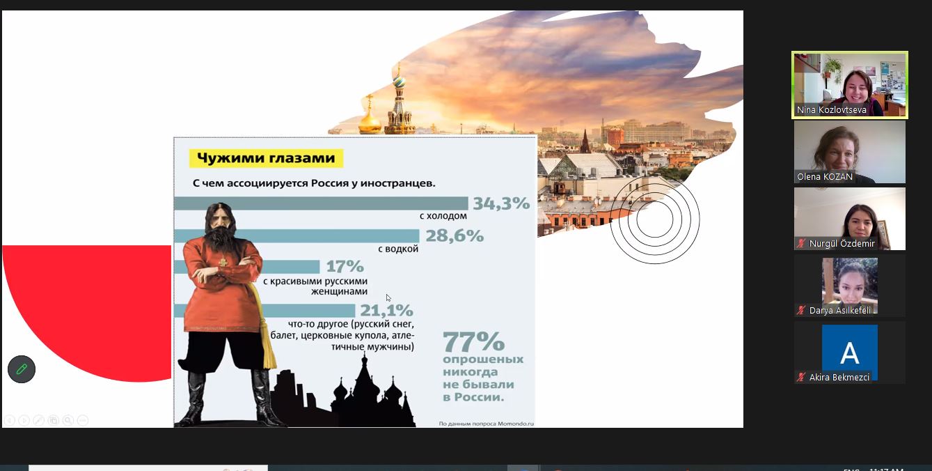 3 мая состоялась лекция кандидата культурологии, доцента Департамента иностранных языков и межкультурной коммуникации Козловцевой Нины Александровны для студентов-лингвистов 1-4 курсов Университета Хаджи Байрама Вели (Анкара, Турция).