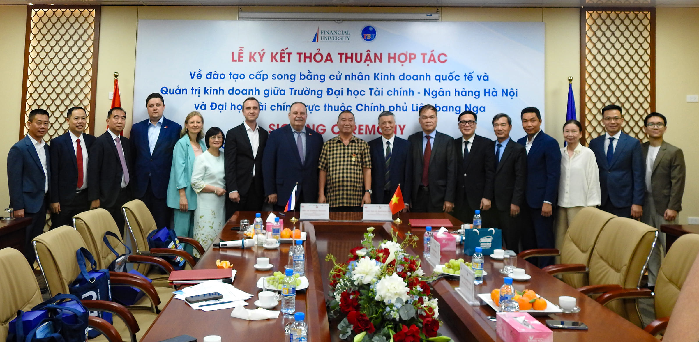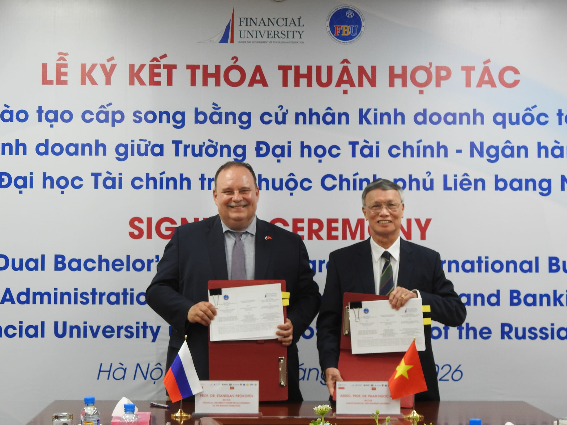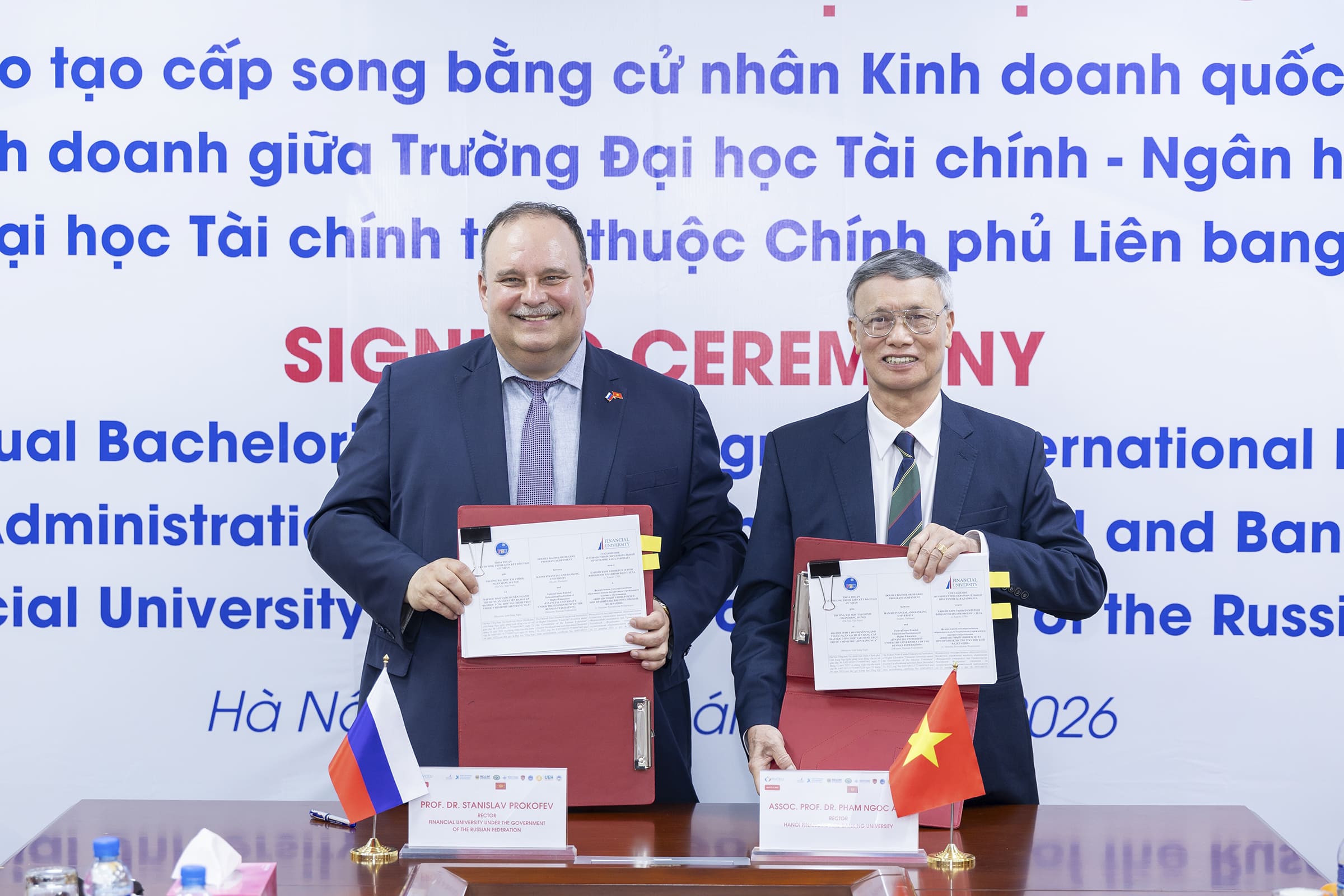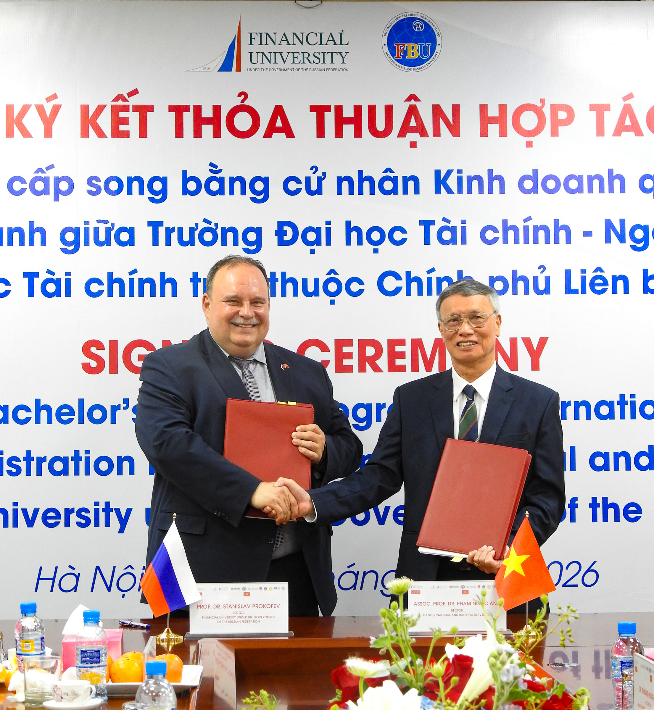 Финансовый университет при Правительстве Российской Федерации и Ханойский университет финансов и банковского дела подписали соглашение о реализации сетевой программы двух дипломов. Церемония подписания соглашения состоялась 9 апреля 2026 года в рамках Российско-Вьетнамского фестиваля культуры и спорта в Ханое. Подписи на документе поставили ректор Финансового университета Станислав Прокофьев и ректор Ханойского университета финансов и банковского дела, господин Фам Нгок Ань.