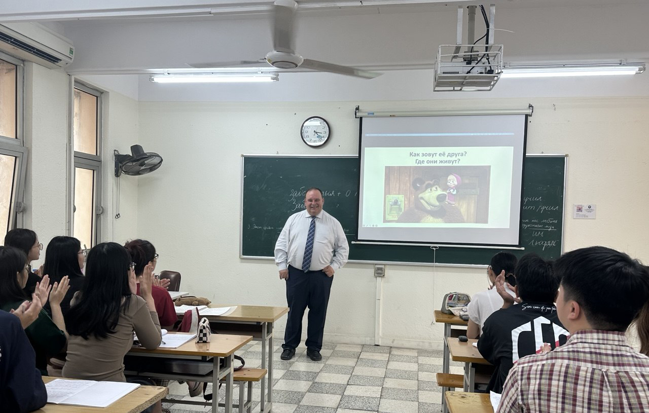 Делегация Финансового университета посетила занятия студентов, изучающих русский язык на Факультете русского языка Университета языков и международных исследований ВНУ. Станислав Прокофьев выступил перед аудиторией, рассказал о Финансовом университете. Также для вьетнамских обучающихся был проведен небольшой тест на кинематографическую тематику. Студенты, в свою очередь, высказали большую заинтересованность в участии в будущих программах академических обменов.