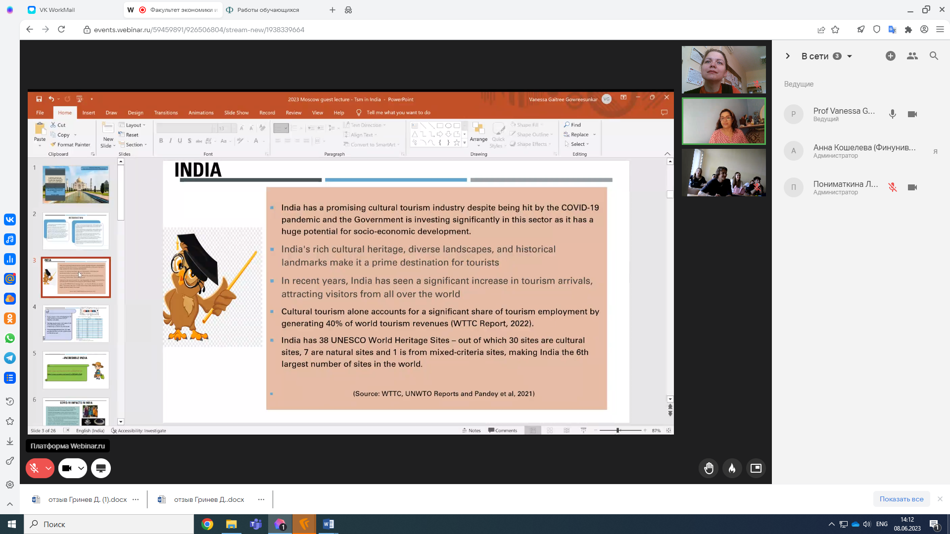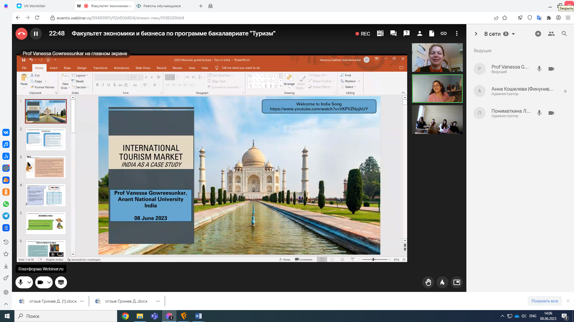 8 июня 2023 года для студентов факультета экономики и бизнеса, обучающихся на направлении «Туризм» прошла гостевая лекция профессора Ванессы Гейтри Гоурисункар из Национального университета Анант (Республика Индия) на тему «Международный туристический рынок» на примере Индии.
