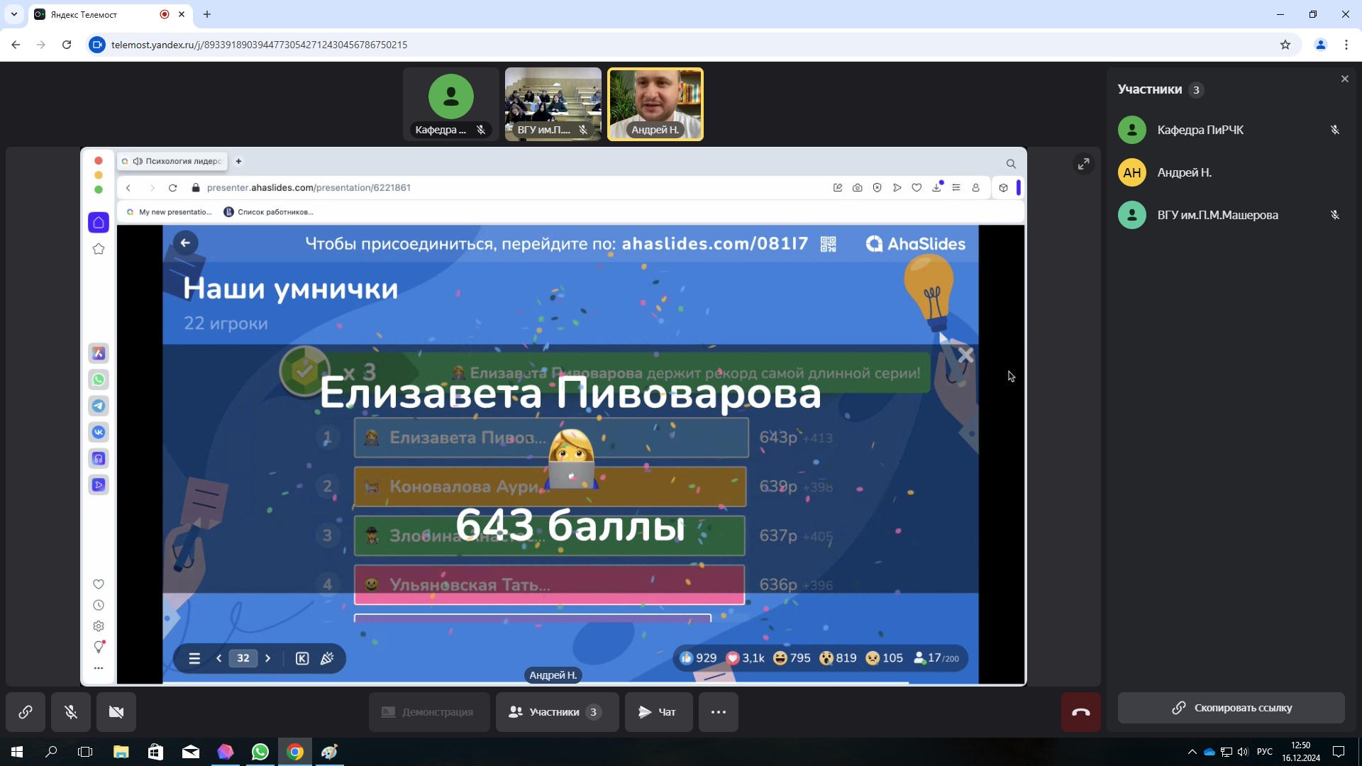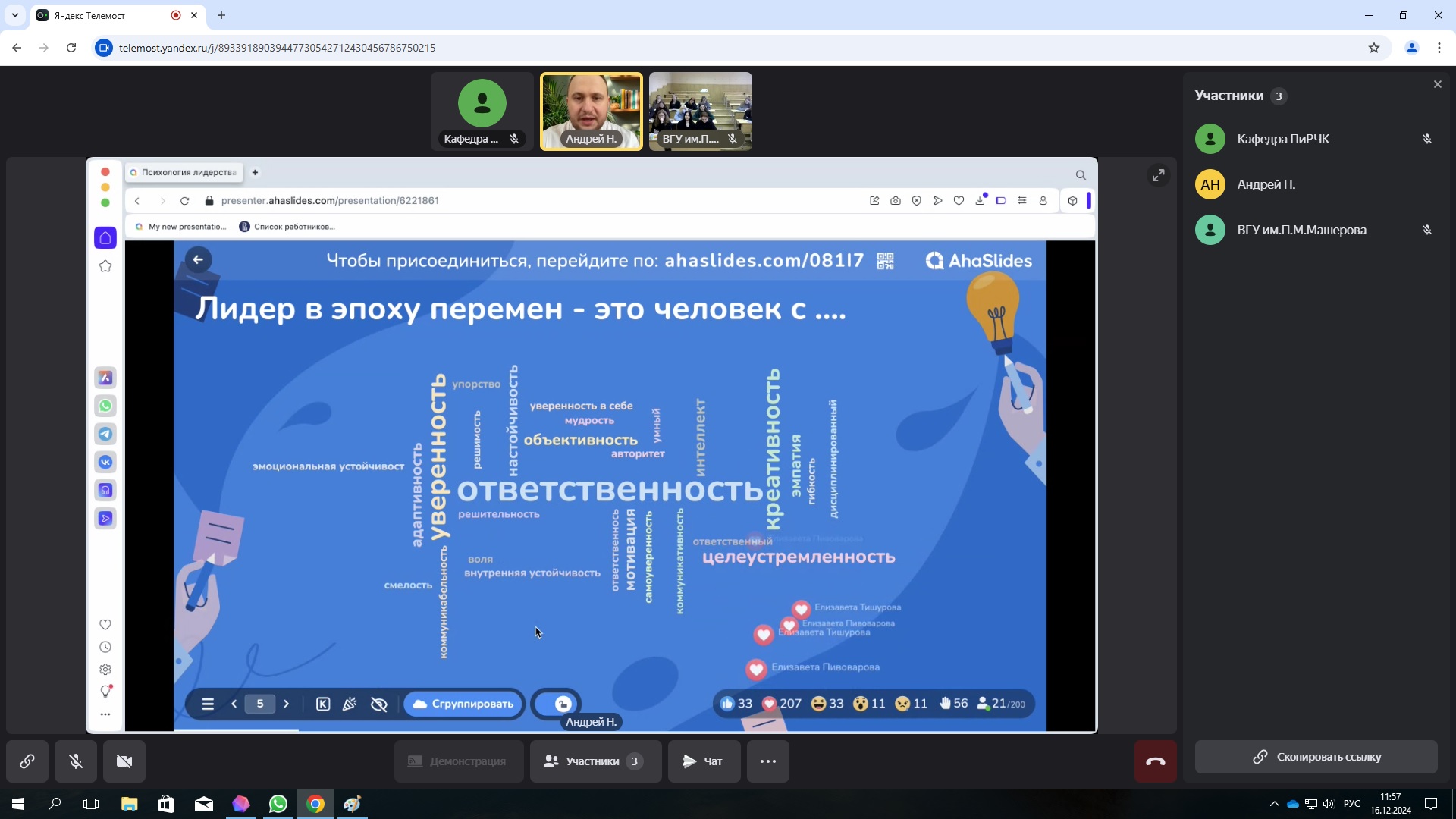 16 декабря 2024 г. в рамках программы «Приглашенный профессор» Неврюев А.Н. прочитал студентам Витебского государственного университета имени П.М. Машерова (специальность Психология) лекцию на тему «Психология лидерства в эпоху неопределенности» в интерактивном формате. В лекции были описаны основные личностные и социально-психологические особенности, с помощью которых можно описать лидера, способного мотивировать команду.