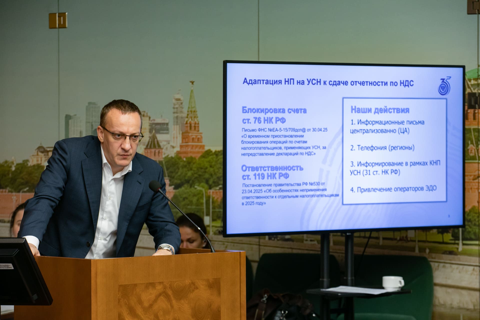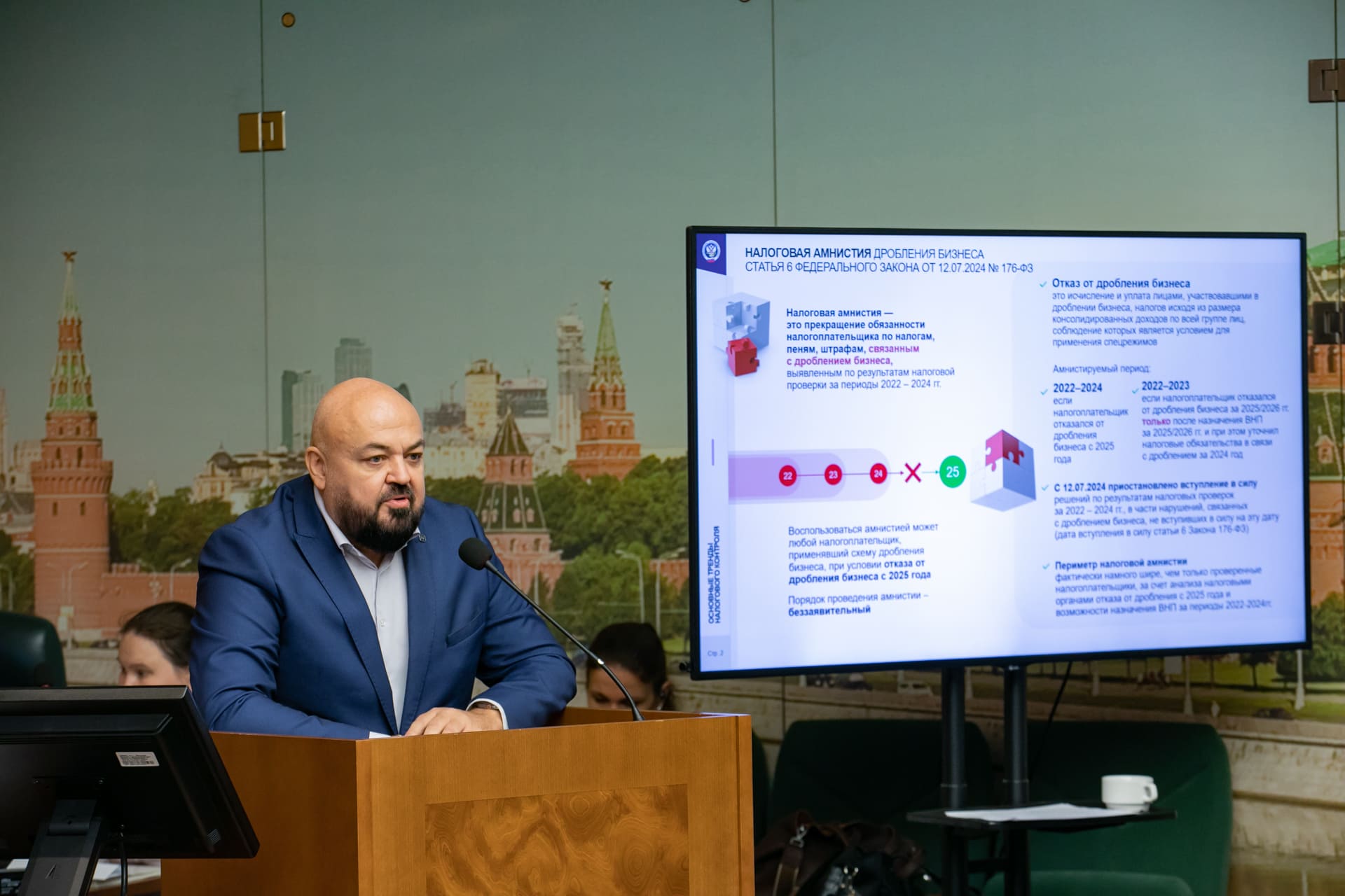 В рамках заседания с докладами выступили представители ФНС России. Заместитель руководителя Федеральной налоговой службы Светлана Бондарчук представила доклад об автоматизации вычетов по НДФЛ. Заместитель начальника Контрольного управления Константин Новоселов рассказал о результатах амнистии по дроблению, также заместитель руководителя Федеральной налоговой службы Александр Егоричев подвел предварительные итоги администрирования НДС для «упрощенцев» за 9 месяцев 2025 года. Завершила серию выступлений член Общественного совета при ФНС России Маргарита Пальцева с докладом о номинации по Налоговому праву в рамках Всероссийской студенческой олимпиады.