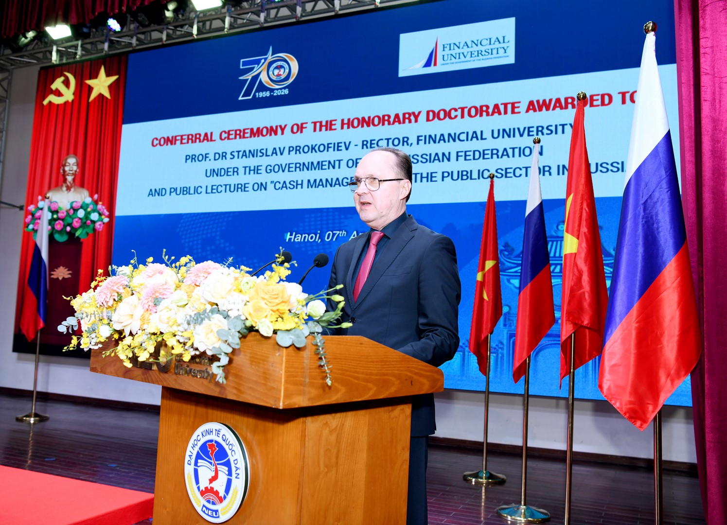 7 апреля 2026 года в Национальном экономическом университете Социалистической Республики Вьетнам состоялась торжественная церемония присвоения звания Почетного доктора ректору Финансового университета, профессору Станиславу Прокофьеву. Звание присуждено за значительный вклад в развитие международного академического сотрудничества, научных исследований и образовательных связей между Социалистической Республикой Вьетнам и Российской Федерацией.