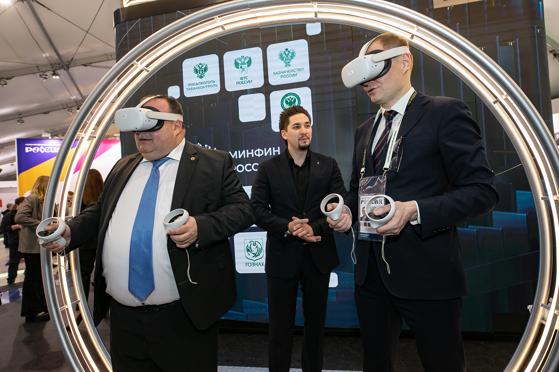 Завершила открытую лекцию экскурсия по стенду Минфина России, в ходе которой Станислав Прокофьев, Роман Артюхин и Александр Леваков осмотрели интегративную экспозицию и протестировали разработки Центра «Киберхаб» Финансового университета – VR тренажер «Путь инвестора» и «VR-кампус».