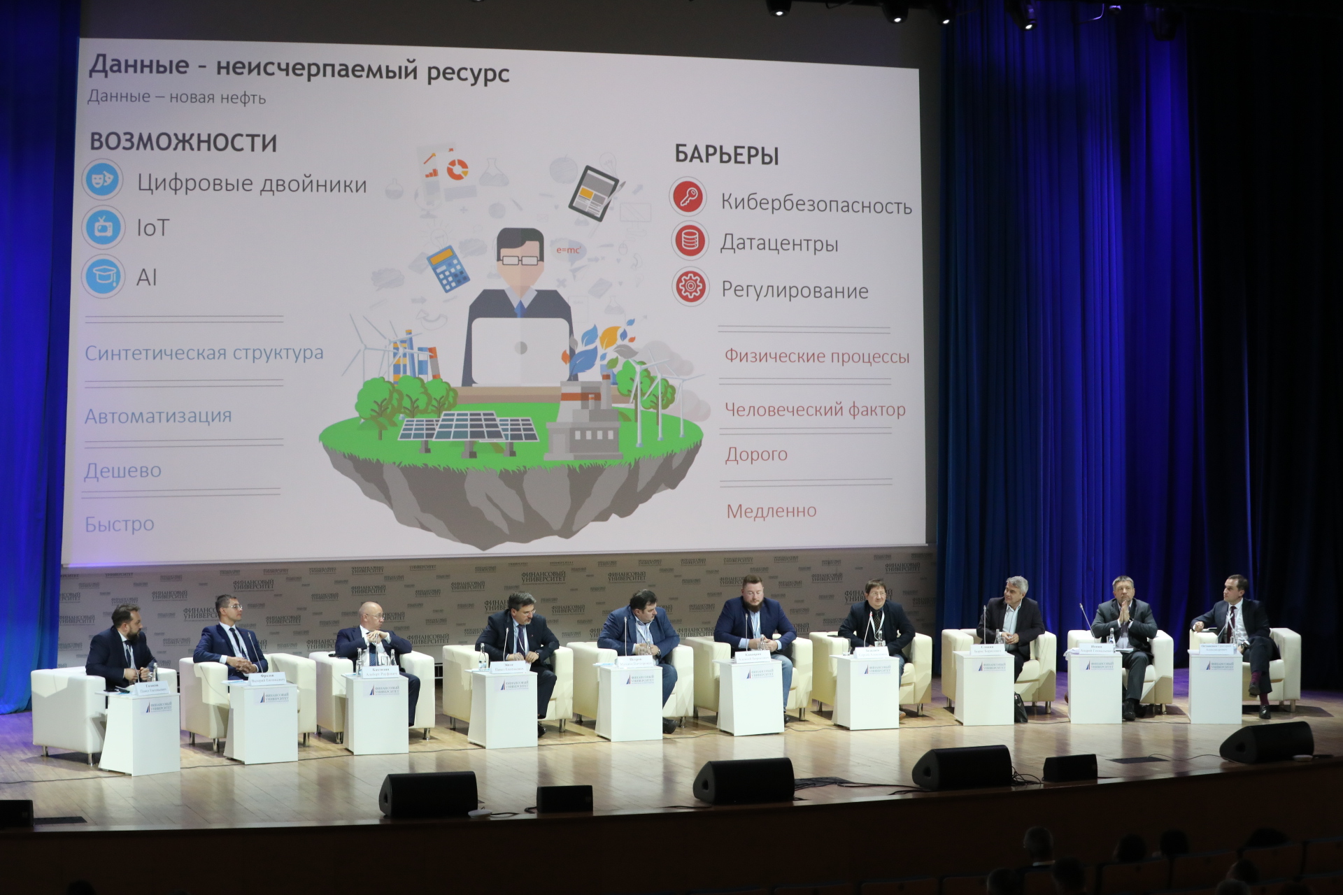 Важной темой форума Финансового университета стала цифровая трансформация отраслей экономики. Участниками профильной сессии «Цифровая трансформация отраслей: где предел?» стали практикующие специалисты и представители научного сообщества: среди ключевых спикеров конференции – директор Центрального экономико-математического института Российской академии наук Альберт Бахтизин, заместитель руководителя Федеральной службы по интеллектуальной собственности Валерий Фролов, руководитель центра продвинутой аналитики АО «АльфаБанк» Алексей Каширин, проректор по цифровизации Финансового университета Григорий Остапенко, руководитель Департамента математики Факультета информационных технологий и анализа больших данных Финансового университета Сергей Зададаев, исполнительный директор Ассоциации профессиональных актуариев Марина Щуклинова. Модератором обсуждения выступил директор Института общественных наук Президентской академии Павел Голосов. В фокусе внимания экспертов дискуссии – основные тренды цифровой трансформации, роль науки и образования во внедрении новых технологий.
