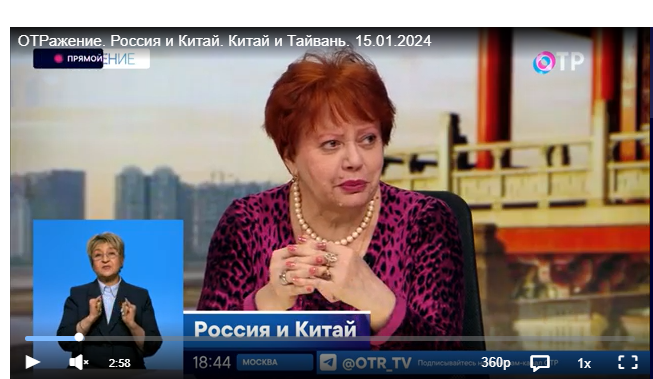 Профессор Виктория Вадимовна Перская, директор Института исследований международных экономических отношений Финансового университета при правительстве РФ, профессор департамента мировой экономики и мировых финансов Финансового университета, выступила на Общественном телевидении России (ОТР) с докладом о состоянии российско-китайского экономического и торгового сотрудничества, а также о перспективах отношений Китая и Тайваня.