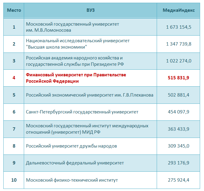 Рейтинг проводится пятый год, и всё это время Финансовый университет входит в топ-10 рейтинга, стабильно повышая свой медиаиндекс.
