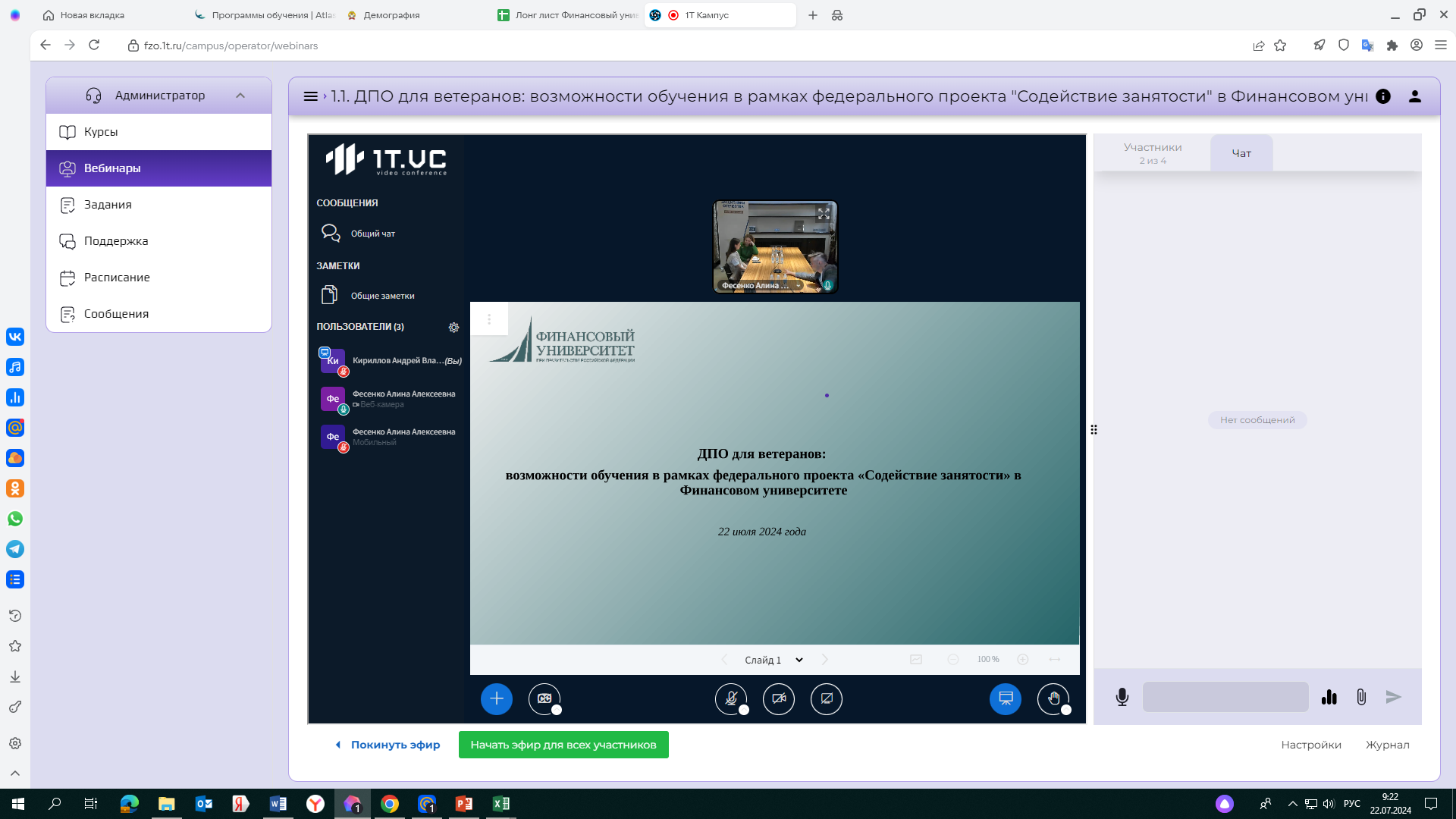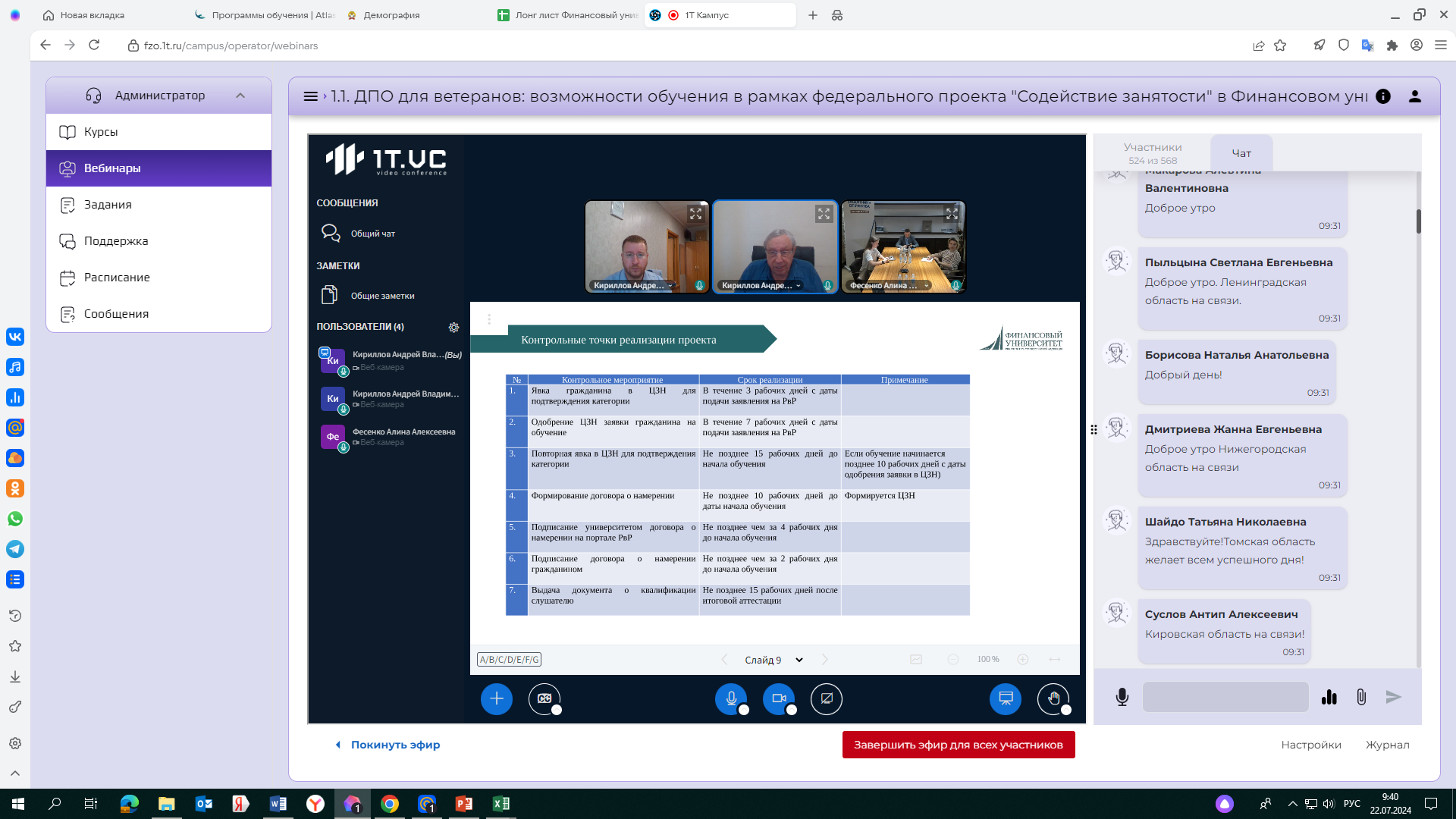 Андрей Кириллов рассказал о реализации Финансовым университетом мероприятий федерального проекта «Содействие занятости» в 2024 году, отметив, что для набора на обучение открыты 22 дополнительные профессиональные программы Финансового университета в более чем 80 субъектах Российской Федерации. Зарегистрироваться на обучение могут граждане отдельных категорий, в том числе ветераны и члены их семей. Более подробная информация о категориях граждан и об обучении: https://trudvsem.ru/information-pages/support-employment/.