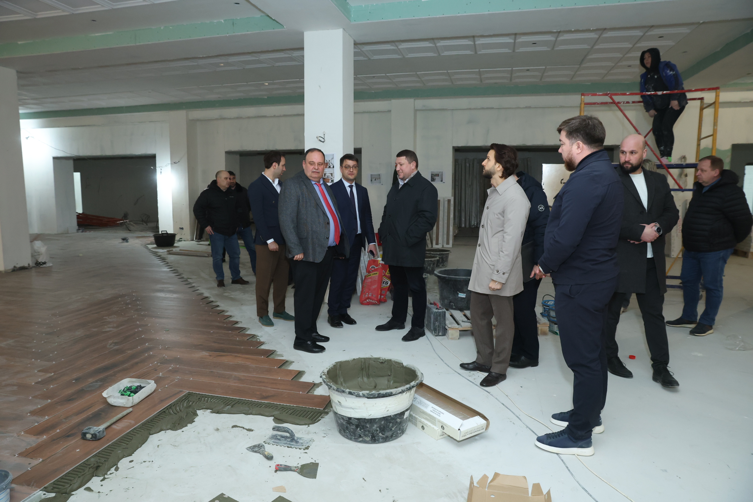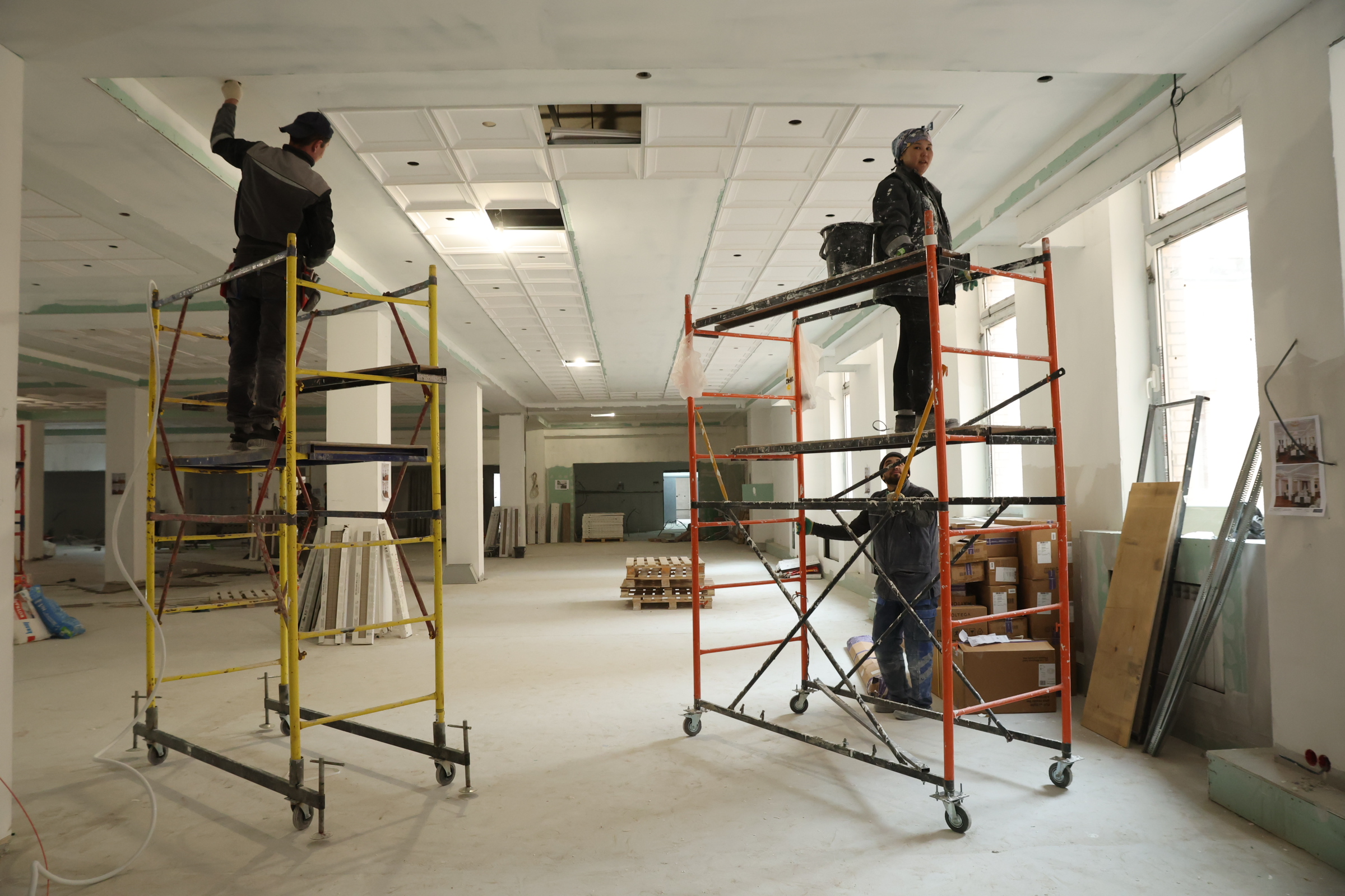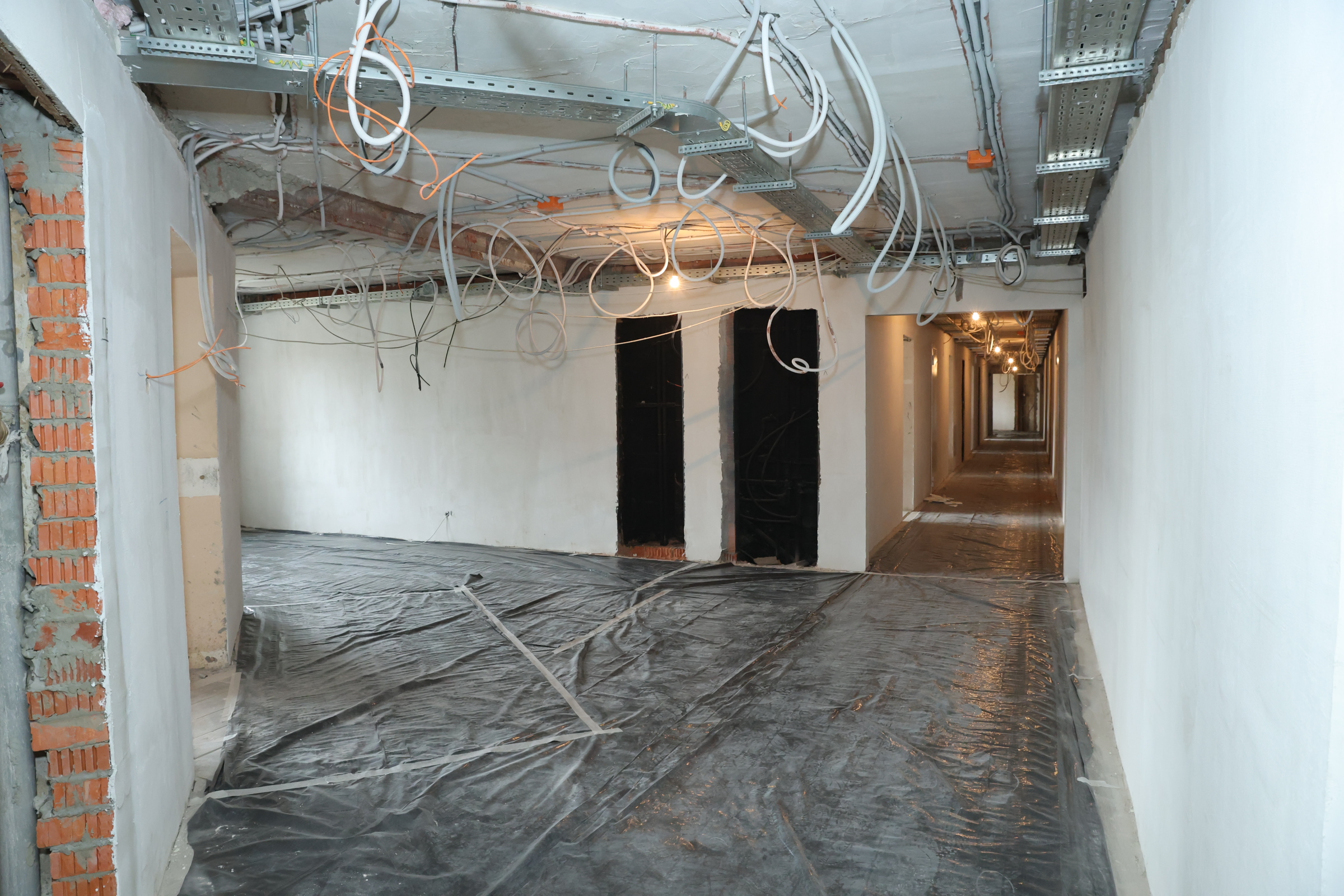 В настоящее время работы на объекте ведутся согласно графику проведения работ: осуществлена замена всех инженерных систем, в жилых и административных помещениях производятся отделочные работы, в подвальной части здания обновляются спортивный зал и бассейн.