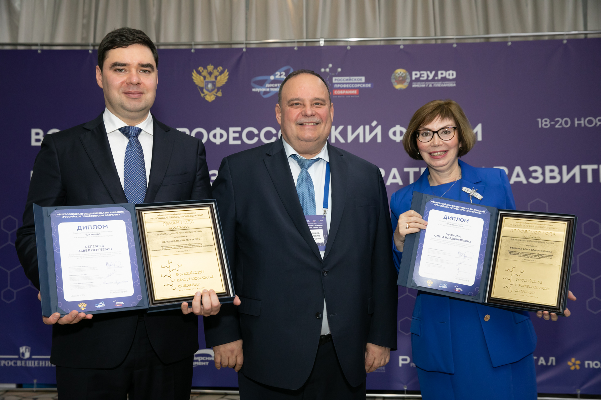 В рамках первого дня форума состоялась церемония награждения лауреатов общенациональных премий РПС: «Профессор года», «Декан года», «Ректор года». Лауреатом общенациональной премии «Декан года» в номинации «Политические науки» стал декан Факультета международных экономических отношений Финансового университета Павел Селезнев. Лауреатом общенациональной премии «Профессор года» в номинации «Экономические науки» стала профессор Кафедры бизнес-аналитики Факультета налогов, аудита и бизнес-анализа Финансового университета Ольга Ефимова.