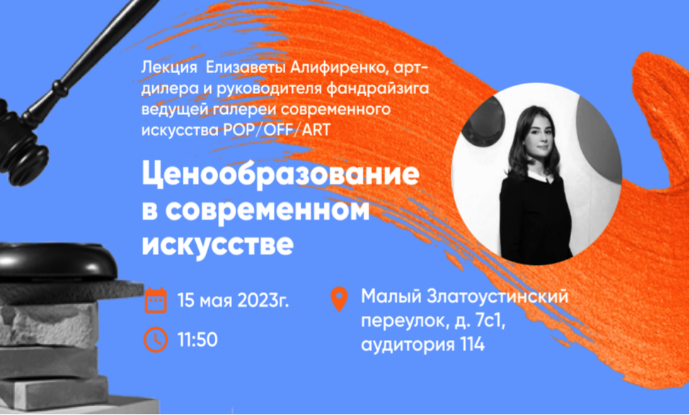 15 мая 2023 года в 11: 50 в Финансовом университете пройдет лекция выпускницы Международного финансового факультета Финансового университета, арт-дилера и руководителя фандрайзига и корпоративных отношений ведущей российской галереи современного искусства POP/OFF/ART Елизаветы Алифиренко.