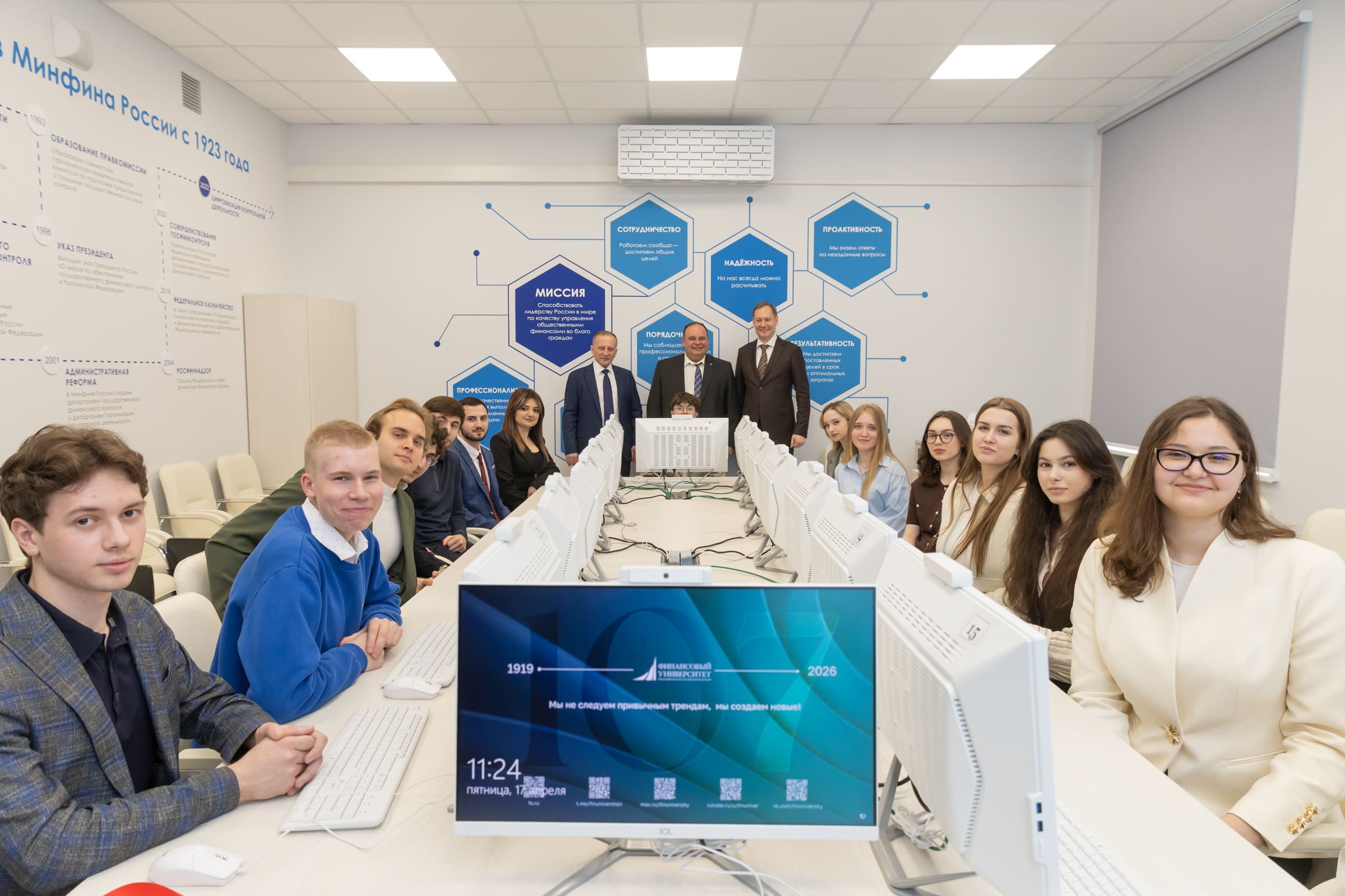 17 апреля 2026 года в Финансовом университете состоялось торжественное открытие Ситуационно-аналитической аудитории Федерального казначейства, участие в котором приняли ректор Финансового университета Станислав Прокофьев, руководитель Казначейства России Роман Артюхин и первый заместитель руководителя Казначейства России, заведующий кафедрой «Финансовый контроль и казначейское дело» вуза Эли Исаев.