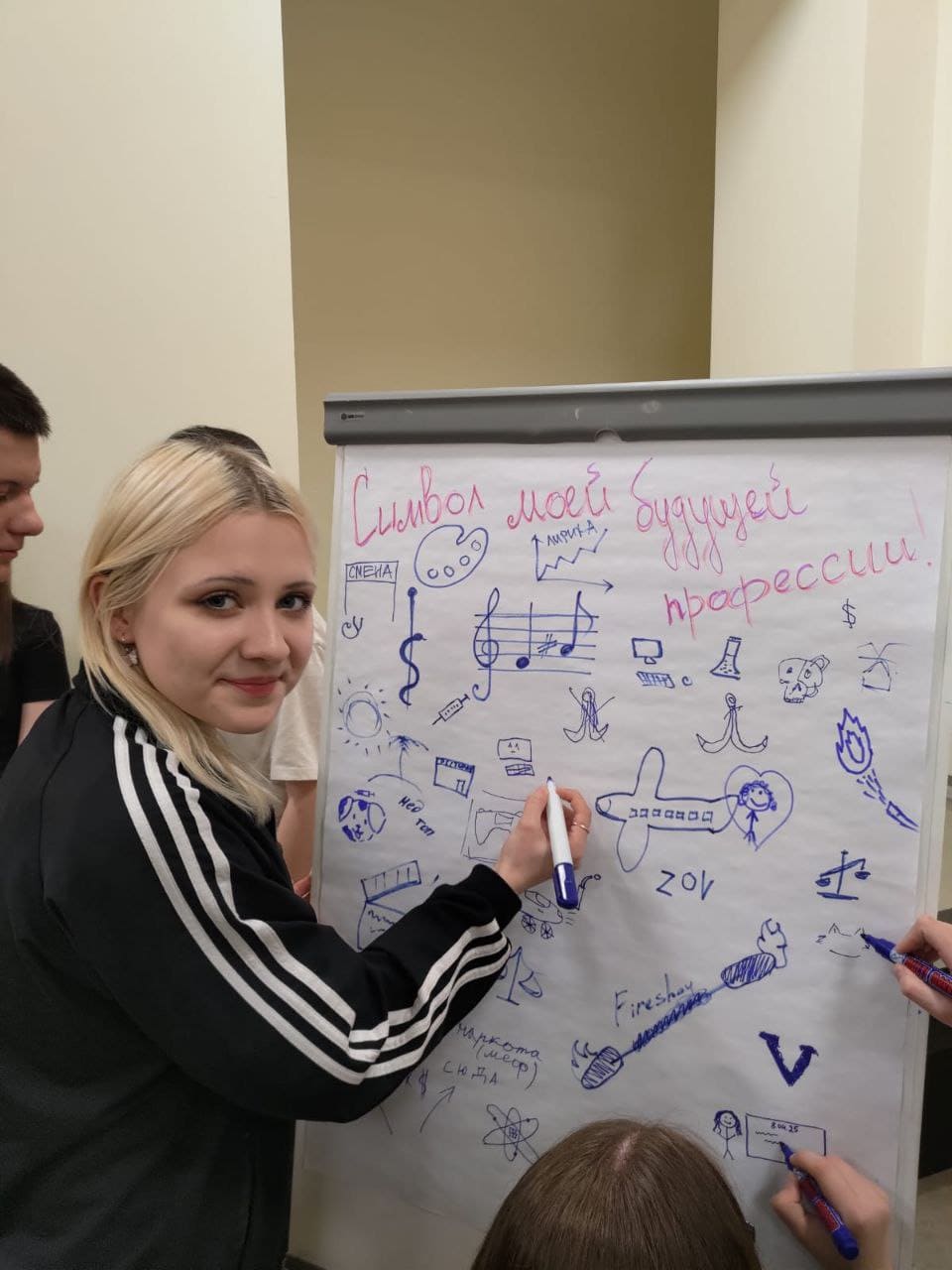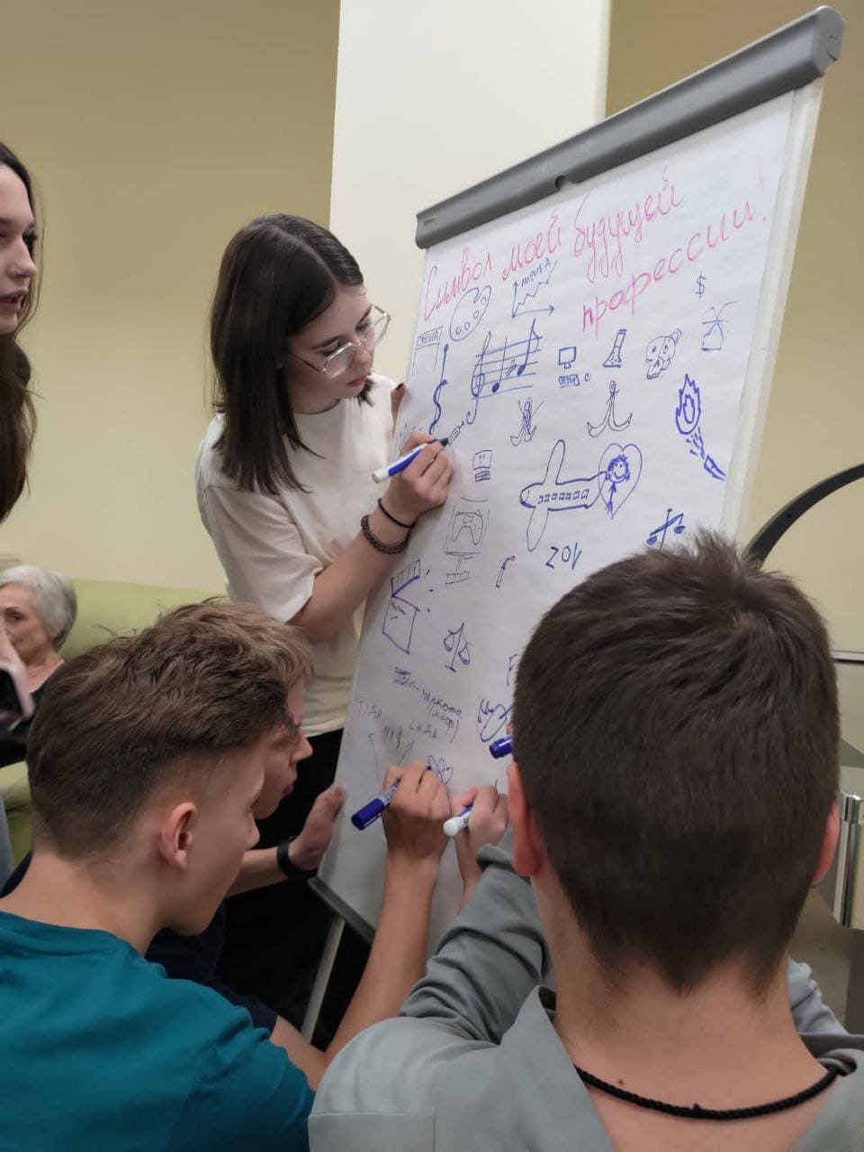 В учебно-оздоровительном комплексе вуза «Лесное Озеро» встреча со старшеклассниками из города Дзержинска началась с творческой работы. Преподаватели Кафедры психологии и развития человеческого капитала Финуниверситета Елена Пряжникова и Ирина Кохова познакомили ребят с Формулой размышлений о направлениях профессионального выбора и критериями, которыми можно и нужно руководствоваться при определении значения той или иной профессиональной сферы. Ребятам предстояло создать символ своей будущей профессии. Многие отмечали, что мечтают работать в сфере здравоохранения, педагогики, в сфере промышленных и инженерных профессий. Ребята также познакомились с практическим вариантом построения профессионального перспективного плана. Они обсудили главные стратегические этапы работы: от этапа выделения главной профессиональной цели до обоснования резервных вариантов выбора будущей деятельности.