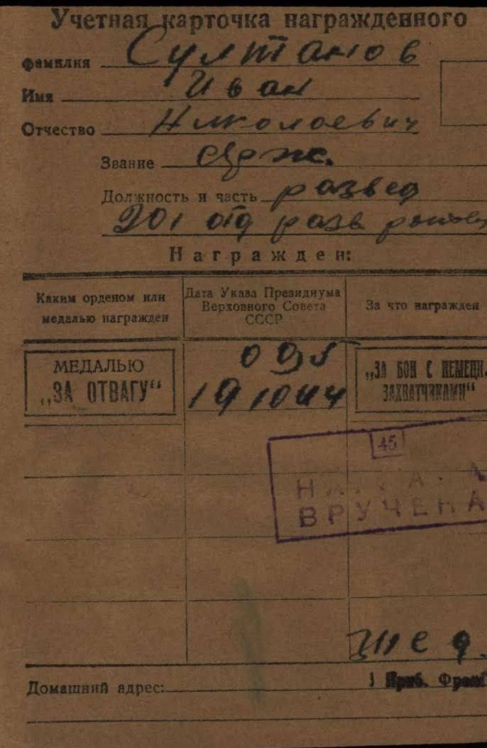 Два года назад руководителю поискового отряда Финансового университета Александру Орлову поступила информация о находке и началась работа по установлению владельца медали по номеру награды, а затем и поиск родственников бойца. Владельцем награды оказался Султанов Иван Николаевич - сержант, разведчик. Предполагается, что награда была потеряна во время боев в 1945 году.