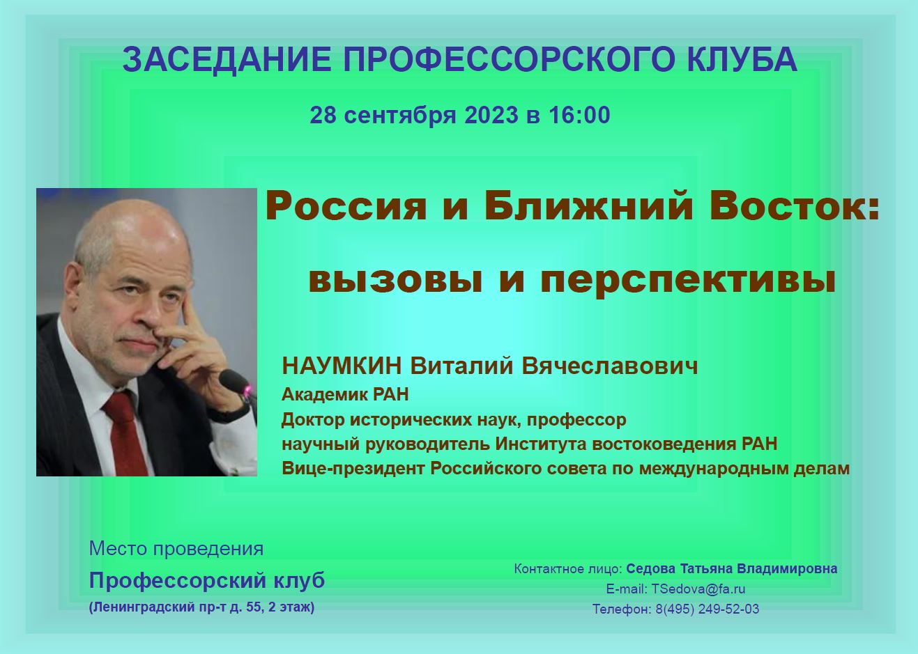 В рамках очередного заседания Профессорского клуба, которое состоится 28 сентября в 16:00, пройдет встреча с Наумкиным Виталием Вячеславовичем, академиком РАН, доктором исторических наук, профессором, научным руководителем Института востоковедения РАН, вице-президентом Российского совета по международным делам. Тема заседания Профессорского клуба: "Россия и Ближний Восток: вызовы и перспективы".