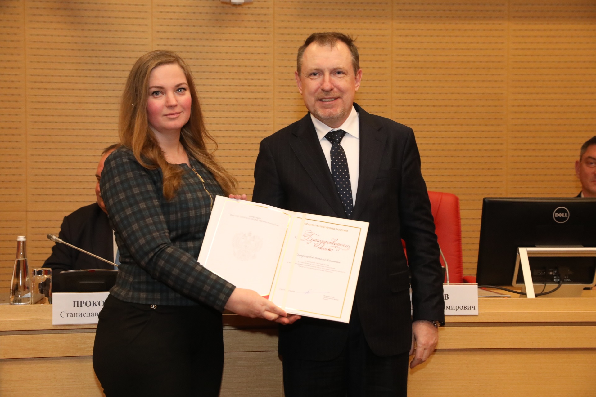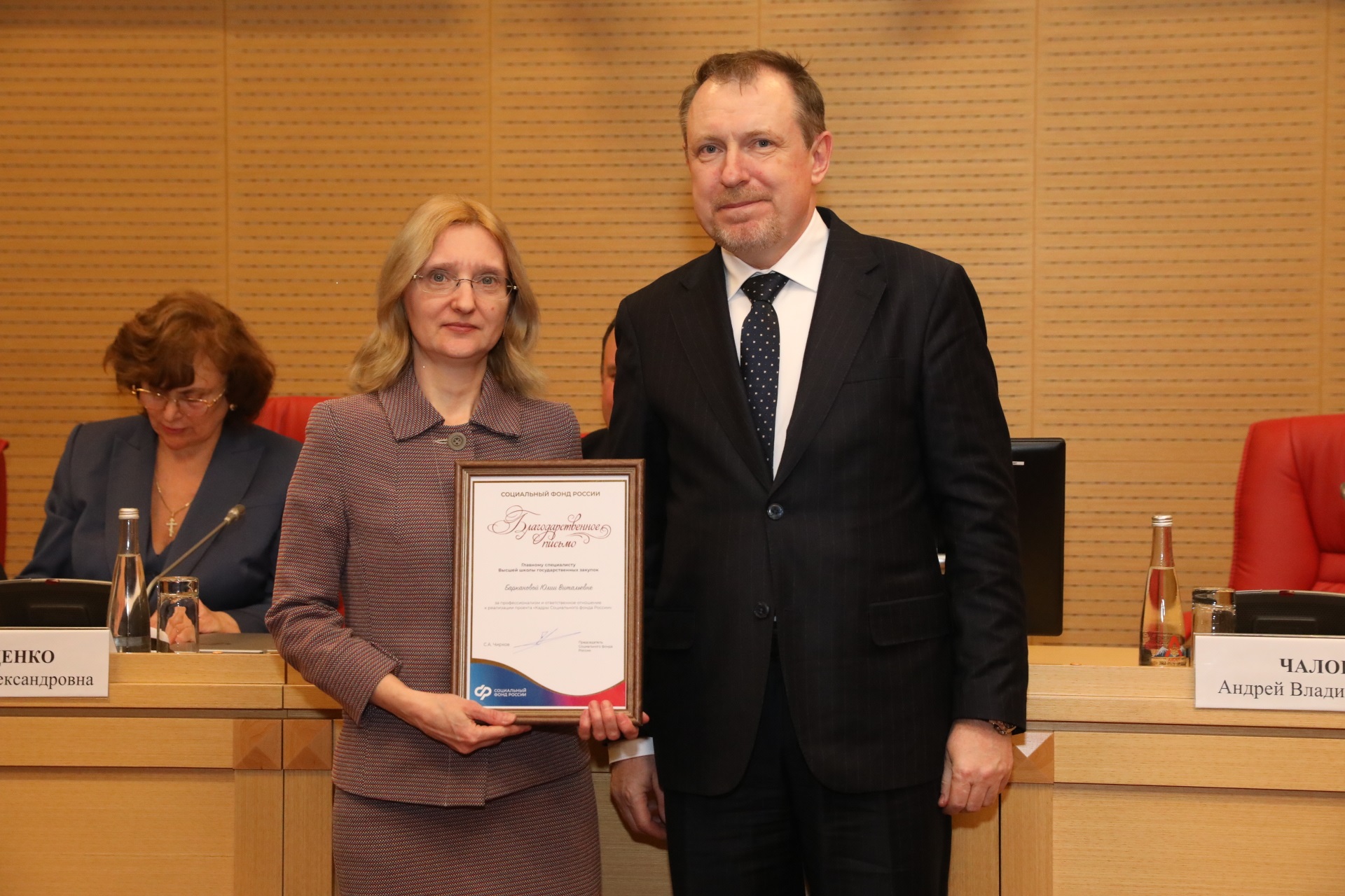 За большой личный вклад в становление партнерских отношений и высокий уровень взаимодействия при реализации проекта «Кадры» Социального фонда России - Серединцева Наталья Алексеевна, директор Высшей школы государственных закупок.