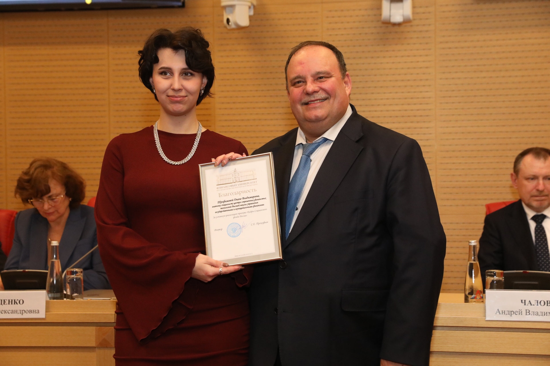 Сотрудников Высшей школы управления государственными и муниципальными финансами: Бондалетова В.В., Левошич Н.В., Дубровину И.О. и Трофимову Д.В. лично поздравил ректор Финансового университета С. Е. Прокофьев