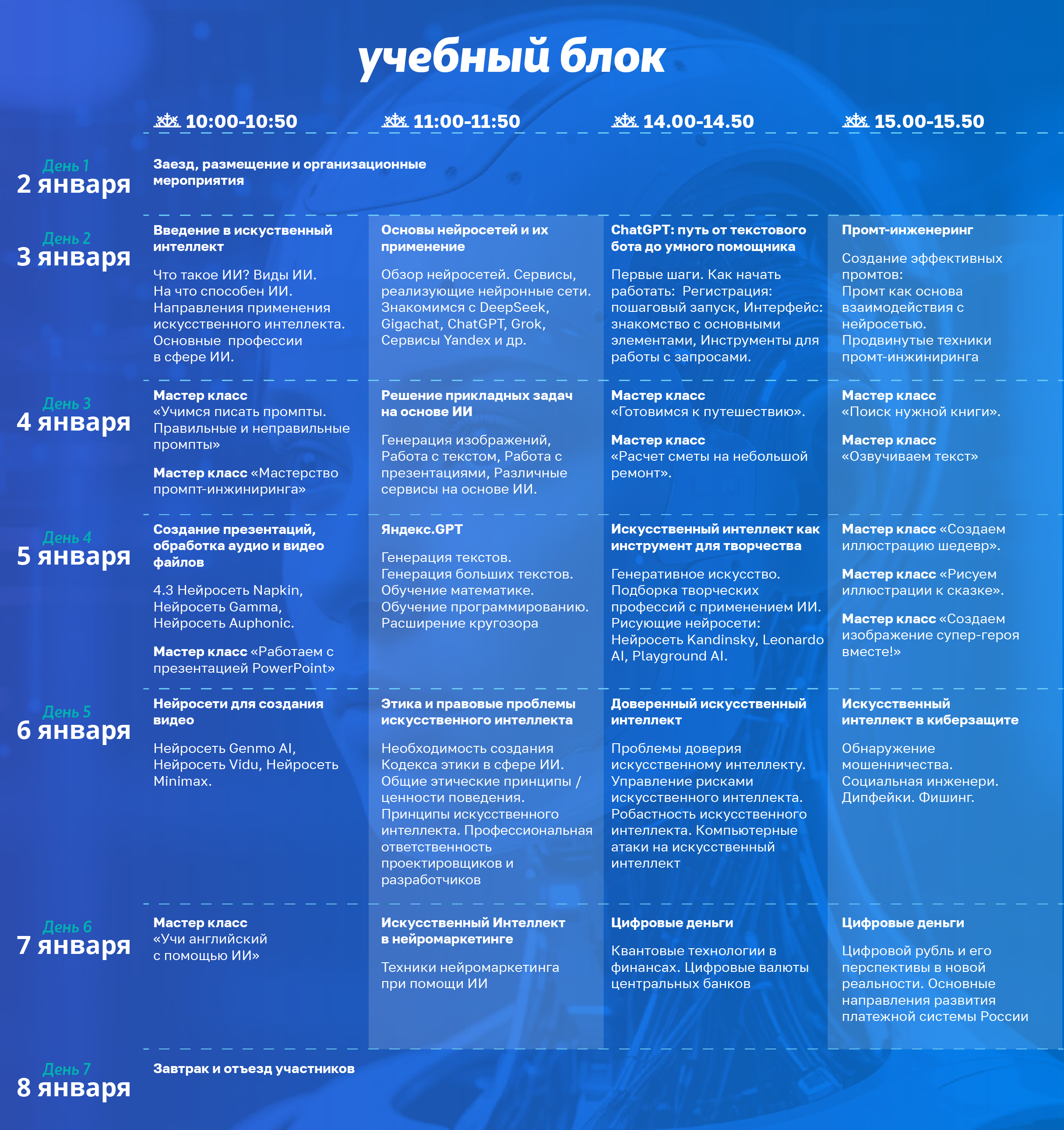 - ежедневные мастер-классы, интерактивы и лекции от преподавателей Финансового Университета, а также интеллектуальные досуговые и спортивные мероприятия;