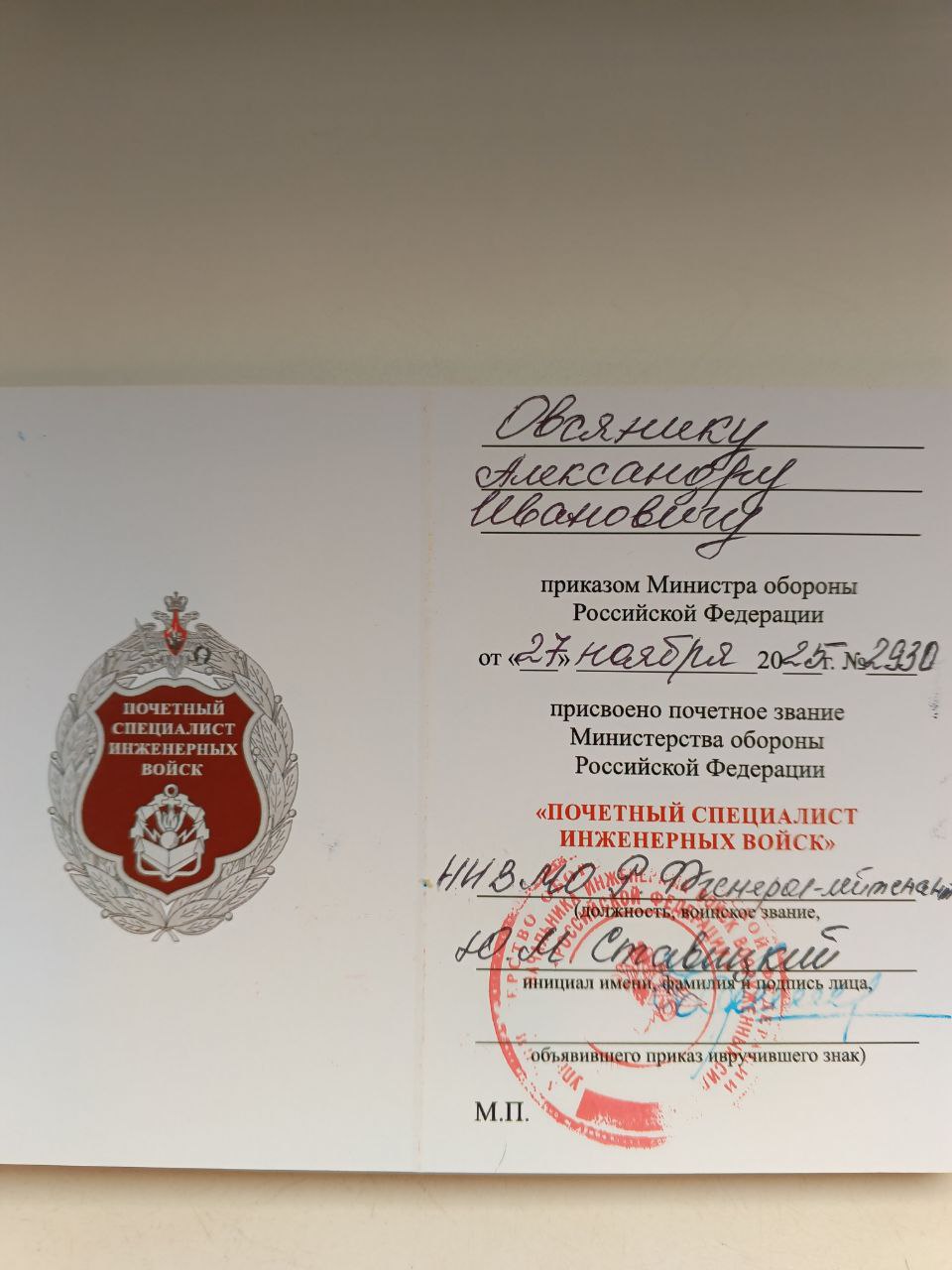 Руководство, профессорско-преподавательский состав и административно-управленческий персонал кафедры «Безопасность жизнедеятельности» Финансового университета при Правительстве Российской Федерации сердечно поздравляет Вас с присвоением почетного звания Министерства обороны «Почетный специалист инженерных войск»!