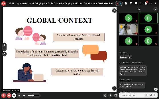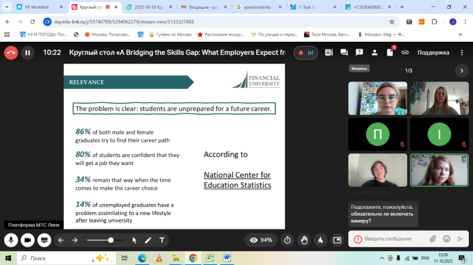 11.10.2025 г. увлекательно и познавательно прошел круглый стол “A Bridging the Skills Gap: What Employers Expect from Finance Graduates Today” в рамках Всероссийского фестиваля Nauka 0+ для студентов 3 курса. Мероприятие стало центром живых дискуссий, объединив 128 человек, студентов и преподавателей Финансового университета под руководством компетентных модераторов, опытных педагогов Кафедры английского языка и профессиональной коммуникации: Вальковой Ю. Е., к.филол.н., доцента, Ивановой Ю. В., к.филол.н., доцента, Карапетовой И. Н., к.филол.н., доцента.