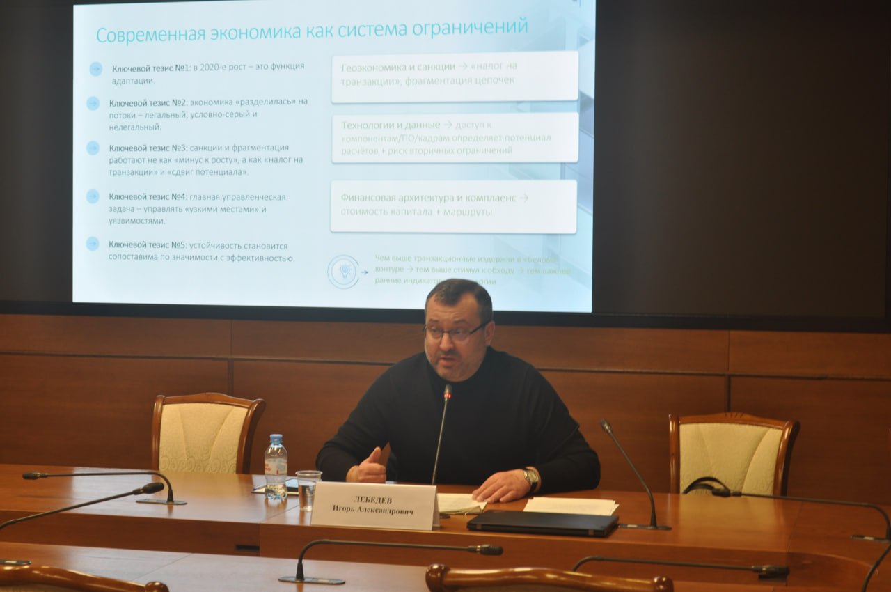 Тема — «Современная экономика, пути развития, возможные сценарии». Лектор показал, как макро‑прогнозы, санкции, инфляция и цифровая трансформация складываются в единую карту для принятия управленческих решений. В основе подхода: сценарное мышление, ранние индикаторы, анализ ограничений и типология обходных схем.