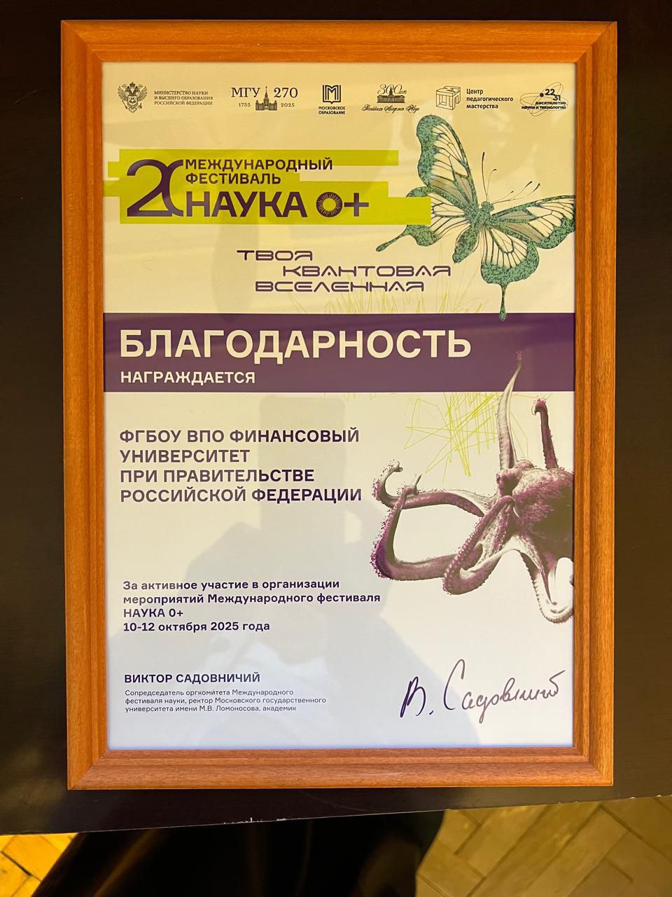 18 октября 2025г. Финансовый университет принял активное участие в Фестивале «НАУКА 0+», организовав площадку: «Квантовые технологии в финансовой метавселенной». Кафедру экономической безопасности и управления рисками представляли студенты бакалавриата профиля «Анализ рисков и экономическая безопасность» и доцент Кафедры экономической безопасности и управления рисками Кабанова Наталья Алексеевна.
