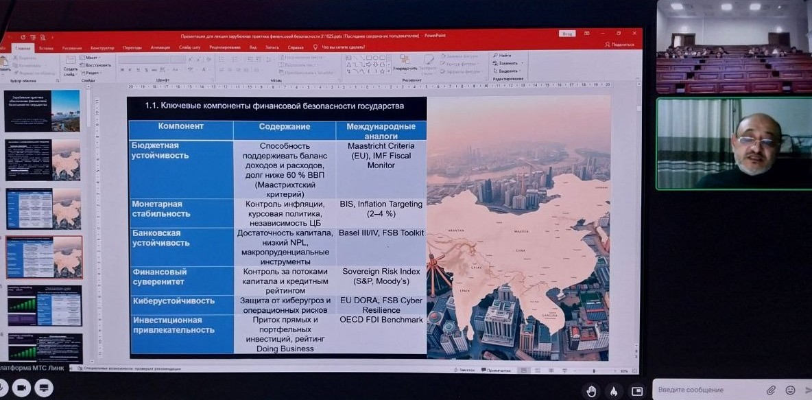 31 октября 2025 г. Кафедра экономической безопасности и управления рисками организовала занятие для студентов Финансового университета при Правительстве РФ по программе «Приглашенный профессор» с участием Атаходжаева Шухратходжи Хаятиллаевича, доцента кафедры «Финансов, анализа и учета» Высшей школы экономики и бизнеса Кыргызского государственного технического университета им. И. Раззакова (г. Бишкек, Кыргызстан).