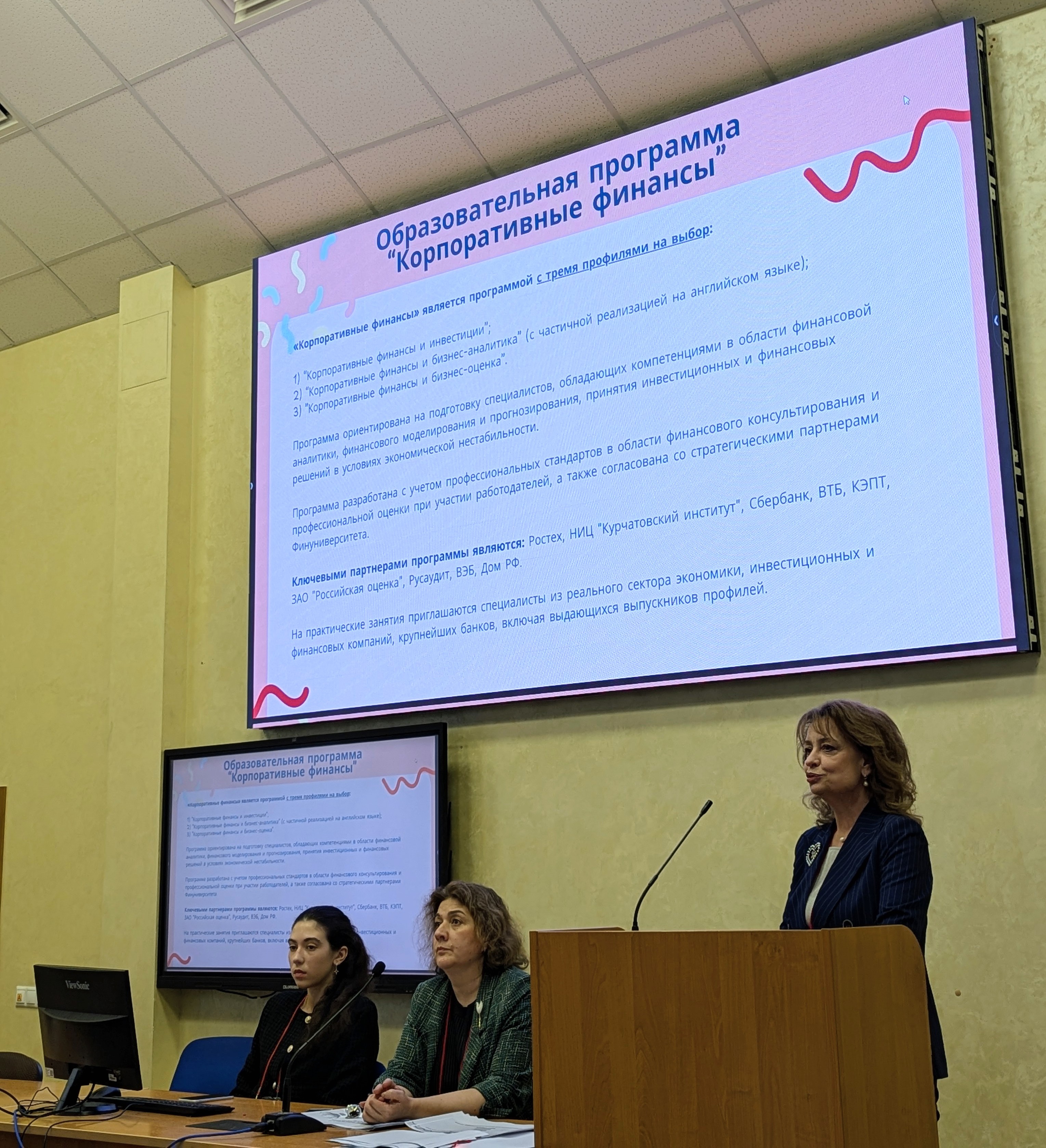 В рамках беседы с абитуриентами и родителями об образовательных программах вместе с руководством деканата Факультета экономики и бизнеса перед гостями выступила заведующий кафедрой, д.э.н., профессор Людмила Ивановна Черникова, которая представила уникальные грани образовательных программ, реализуемых кафедрой, в том числе особенности трех профилей образовательной программы для бакалавриата «Корпоративные финансы» и программу двух квалификаций для бакалавриата «Экономика корпорации, ESG и корпоративное право», которой руководит доцент кафедры, к.э.н., заместитель декана по связям с российскими и международными партнерами Факультета экономики и бизнеса Хвича Патаевич Харчилава.