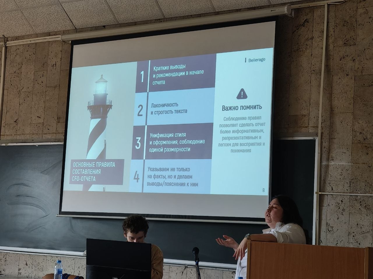 14 апреля 2026 года специалисты ООО «Беллераж Аутсорсинг и Консалтинг» Евгения Солдаткина и Александр Орлов провели мастер-класс на тему «CFO-отчёт: структура, форматы, основные правила и реальный кейс» для студентов группы КФиБА23-1, 2.