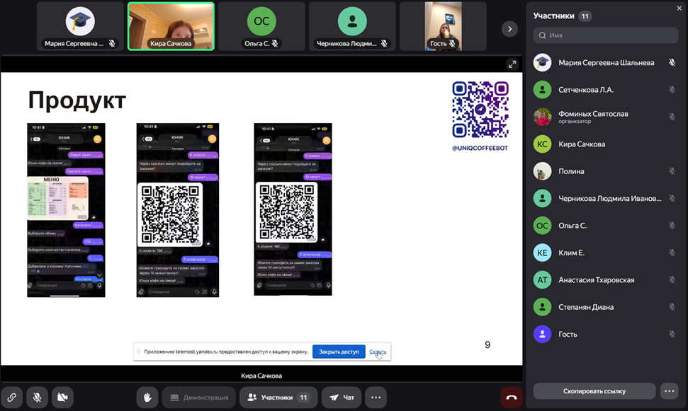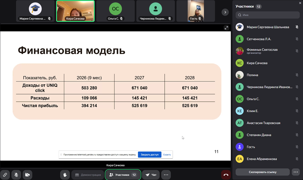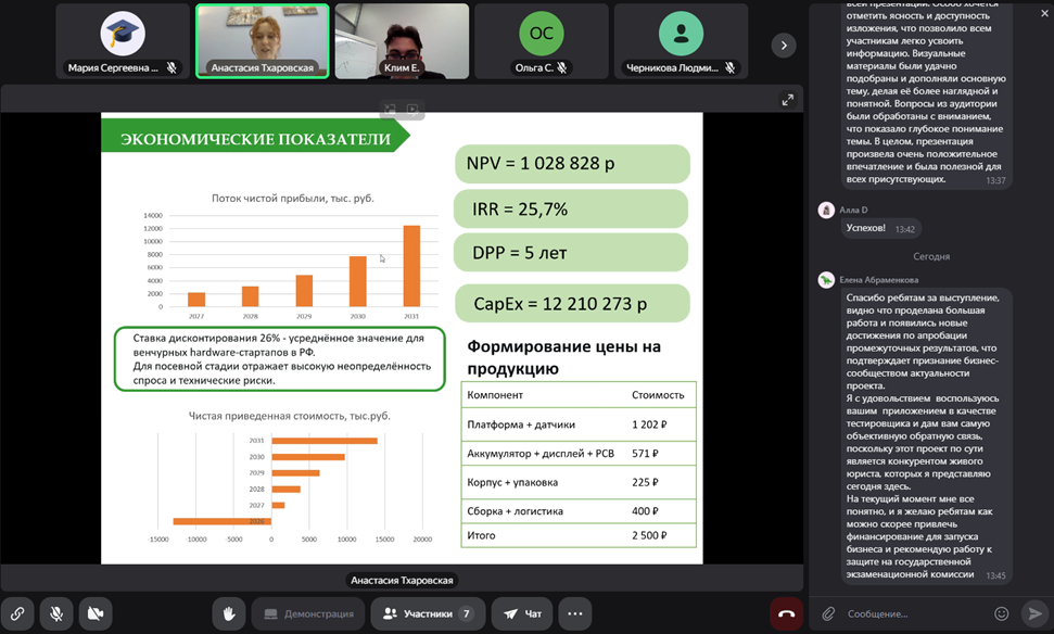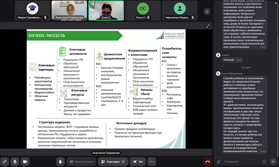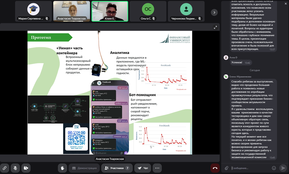 Представители бизнеса задавали студентам уточняющие вопросы по финансовым аспектам выполненных проектов и по технологическим особенностям реализации проекта в текущих реалиях блокировок популярных среди целевой аудитории мессенджеров, являющихся каналами продвижения созданных прототипов продуктов, а также высказывали им свои пожелания относительно подготовки к запуску и реализации продуктов на рынке.