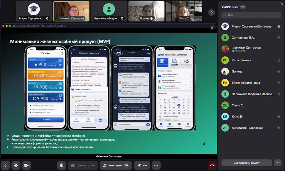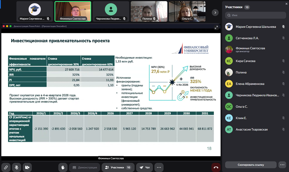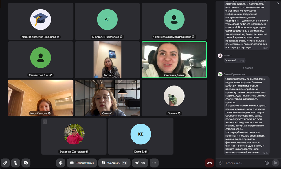 По итогам заслушивания и обсуждения 2 коллективных межпрофильных ВКР-стартапа и 1 индивидуальный ВКР-стартап были рекомендованы к защите в государственной экзаменационной комиссии.