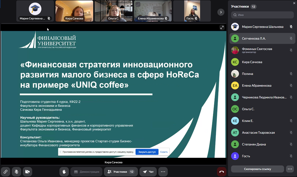 2) «Финансовая стратегия инновационного развития малого бизнеса в сфере HoReCa на примере «UNIQ coffee», автором которого является студентка Факультета экономики и бизнеса Сачкова Кира Геннадьевна (уч. гр. КФ22-2);
