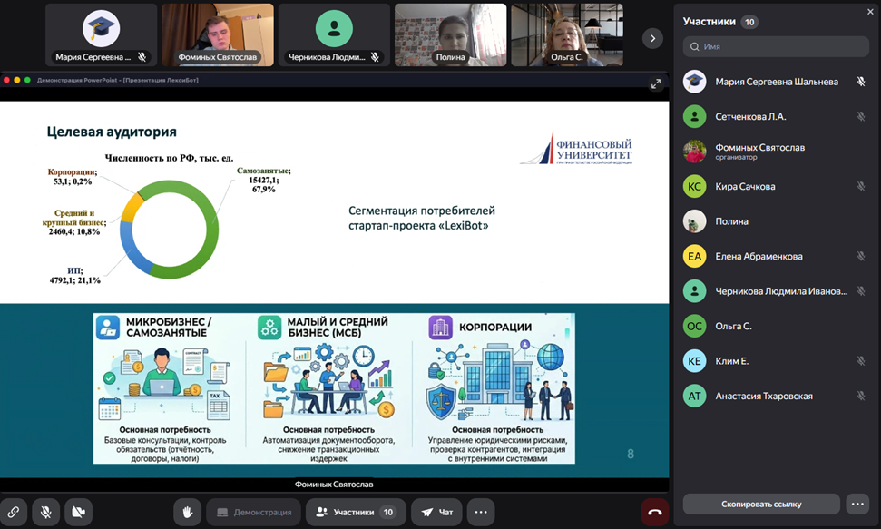 1) «Финансовая стратегия и бизнес-модель развития LegalTech-стартапа «LexiBot» в сфере услуг по сопровождению бизнеса», соавторами которого являются студенты Факультета экономики и бизнеса: Чернышова Полина Сергеевна (уч. гр. КФиБА22-2) и Фоминых Святослав Артемович (уч. гр. КФ22-1);