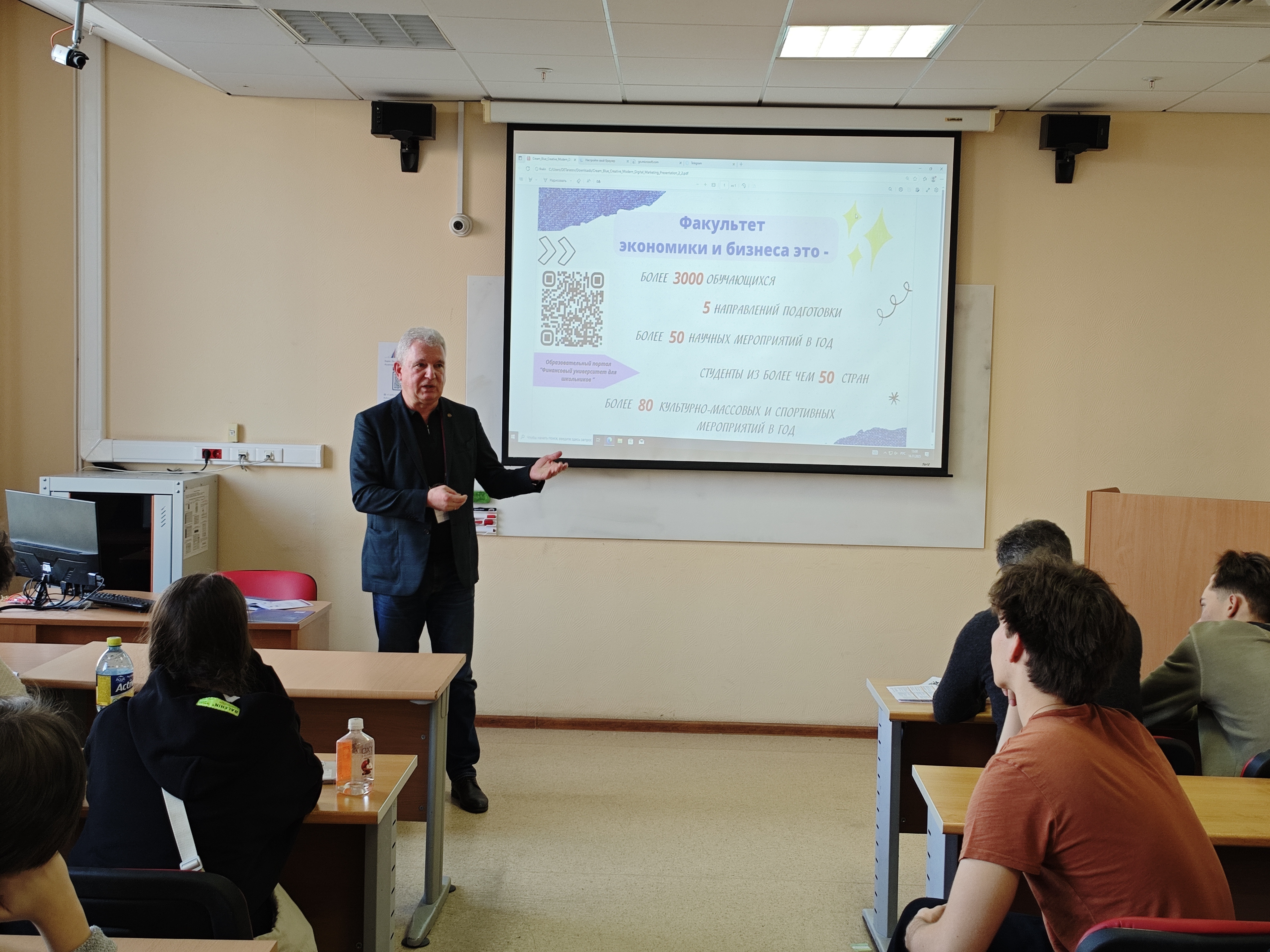 Главными событиями дня открытых дверей являлись выступление ректора в Нобелевском зале и выступления деканов, включая декана Факультета экономики и бизнеса, к.э.н., доцента Безсмертной Екатерины Рэмовны.