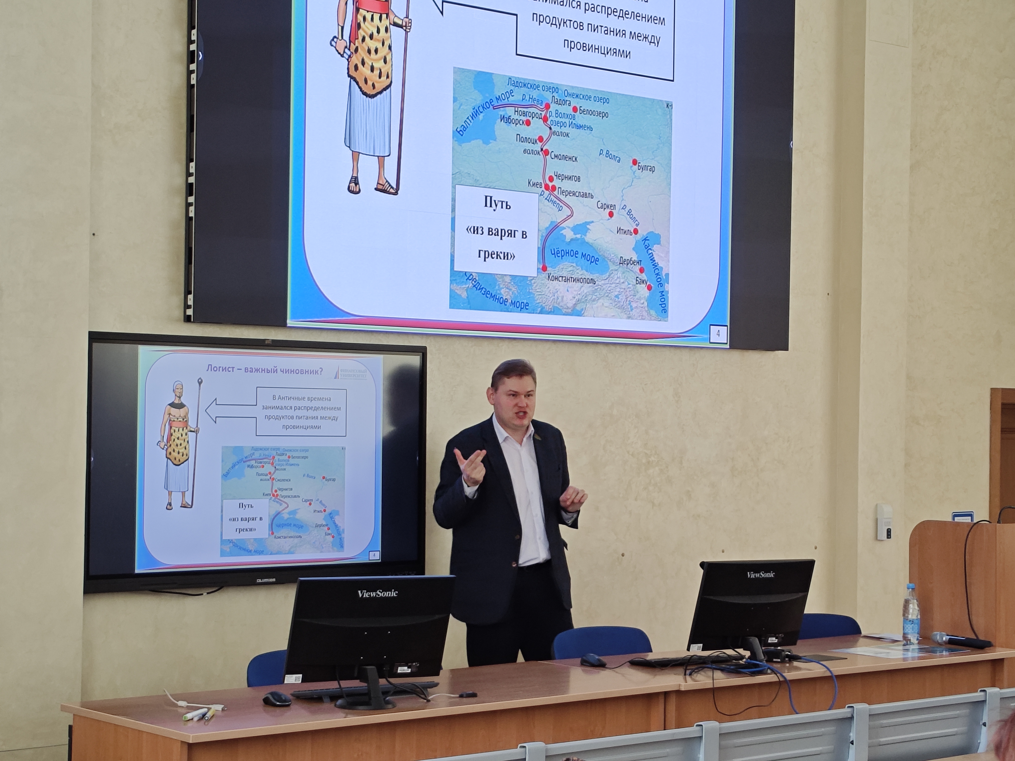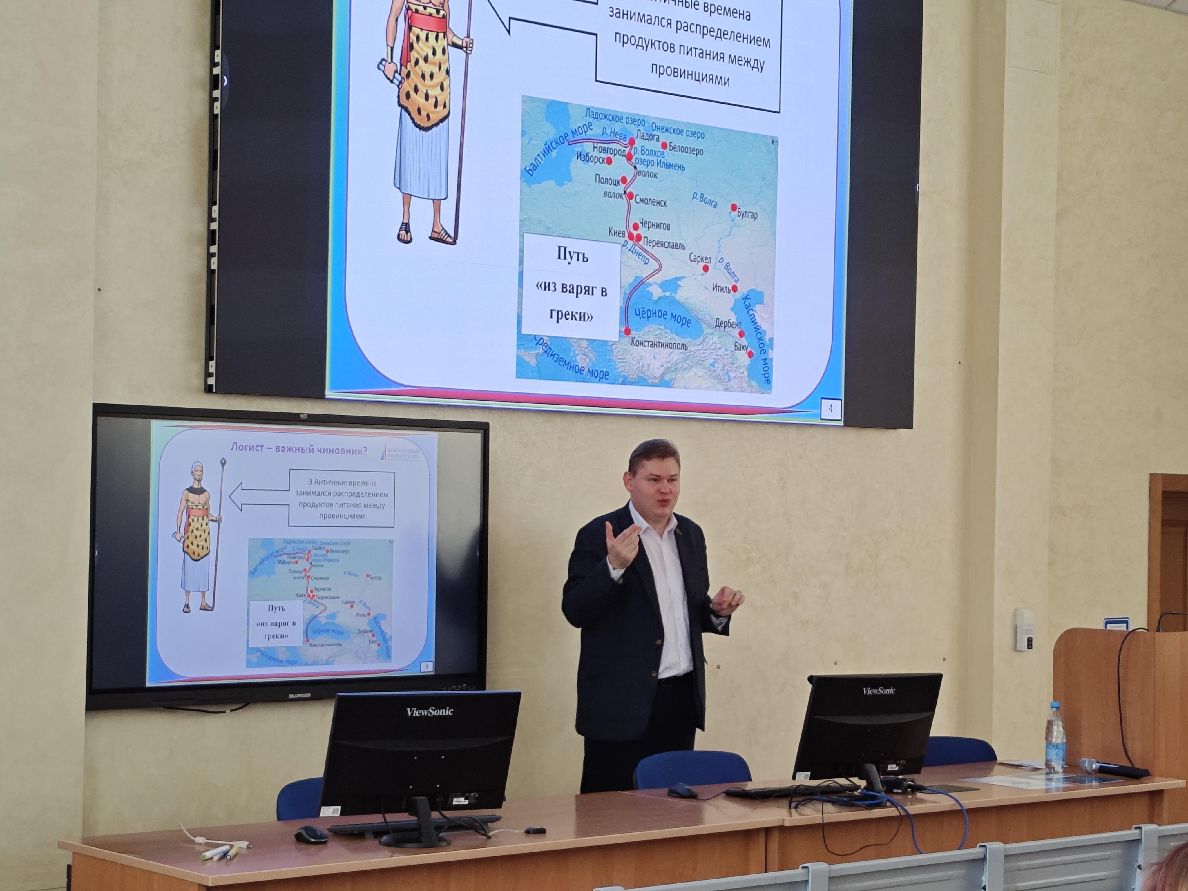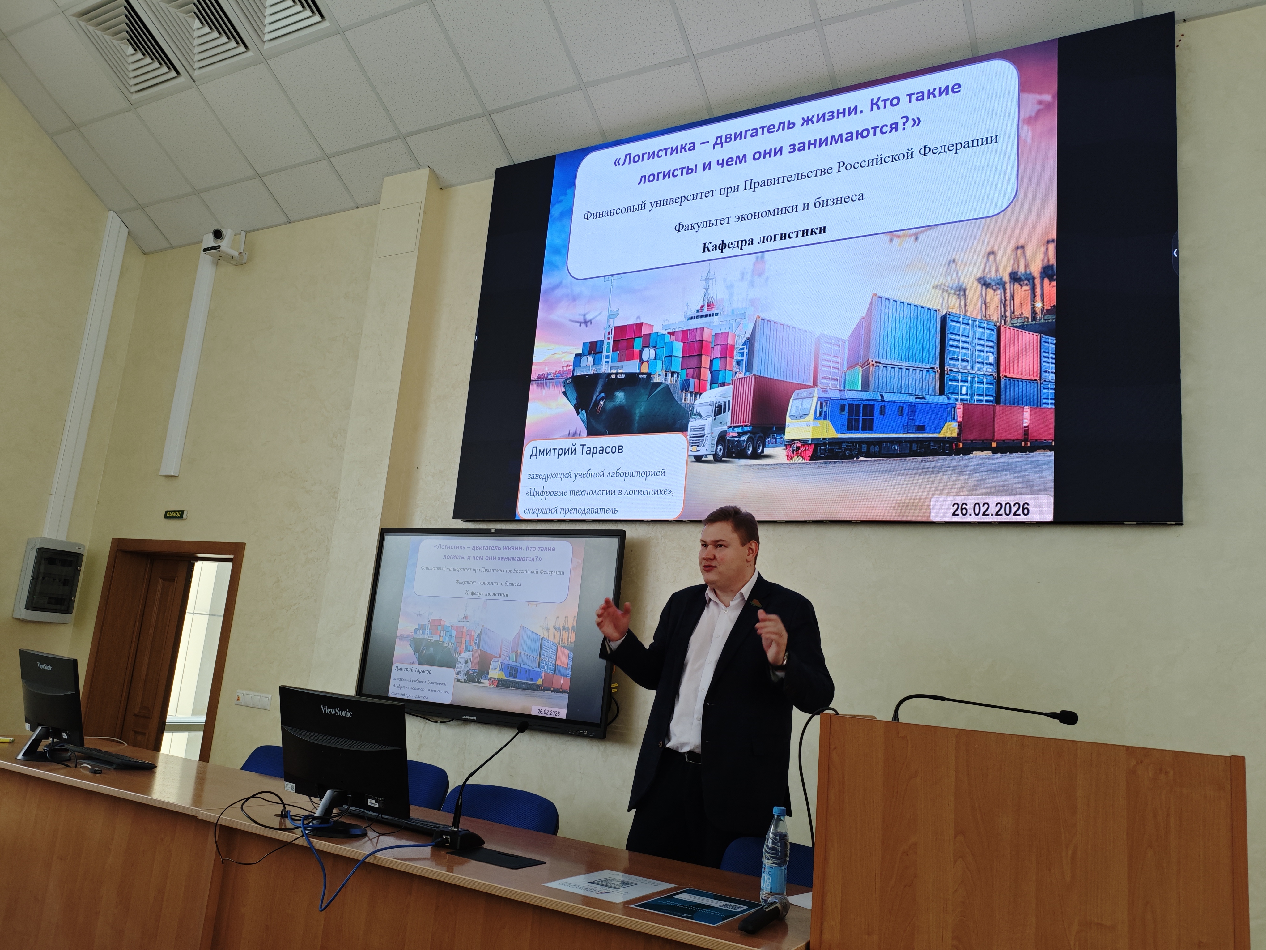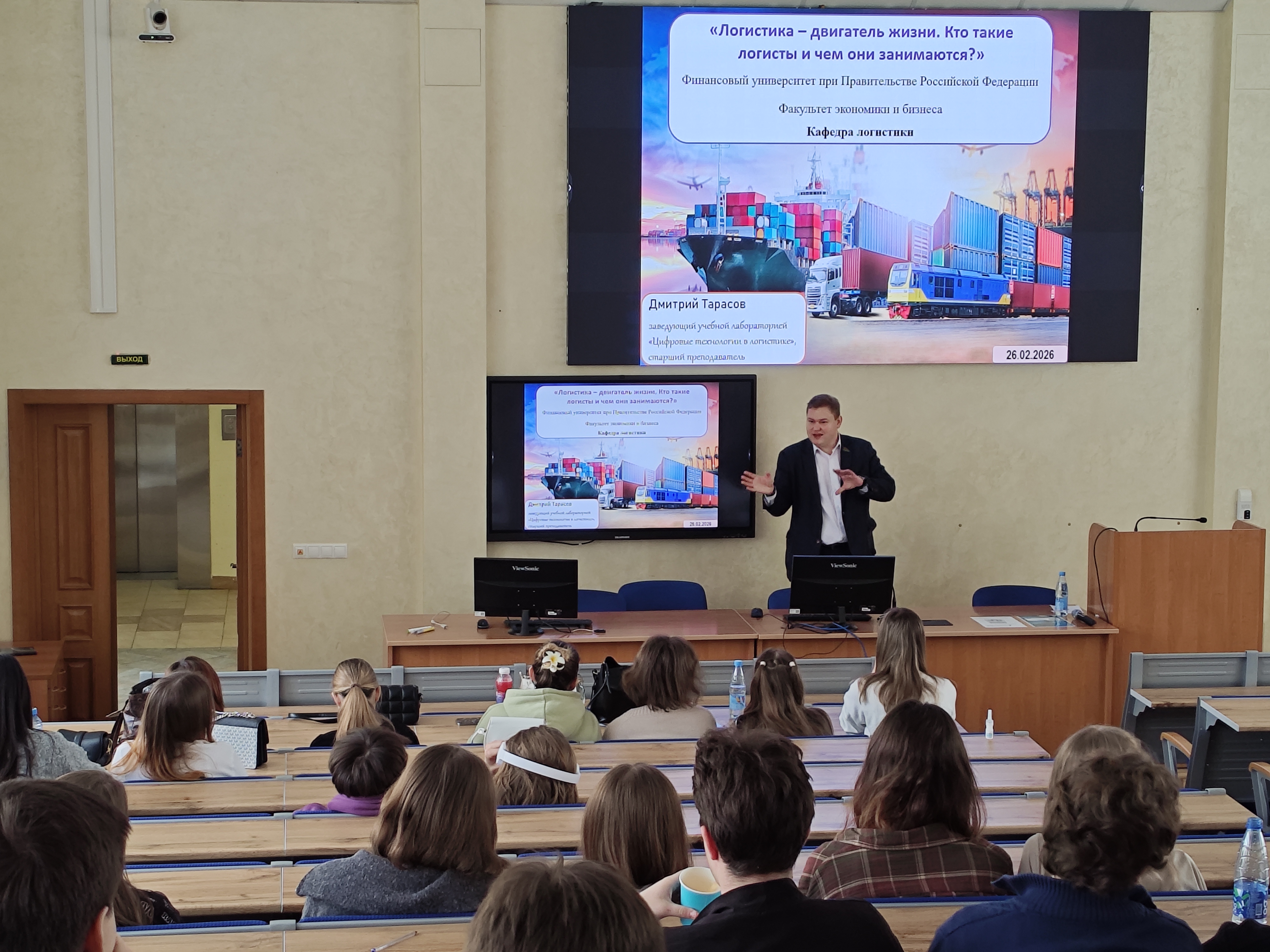 26 февраля 2026 года в рамках недели каникул для школьников на Факультете экономики и бизнеса, преподаватель Кафедры логистики Дмитрий Эдуардович Тарасов провел мастер-класс «Логистика – двигатель жизни. Кто такие логисты и чем они занимаются?»