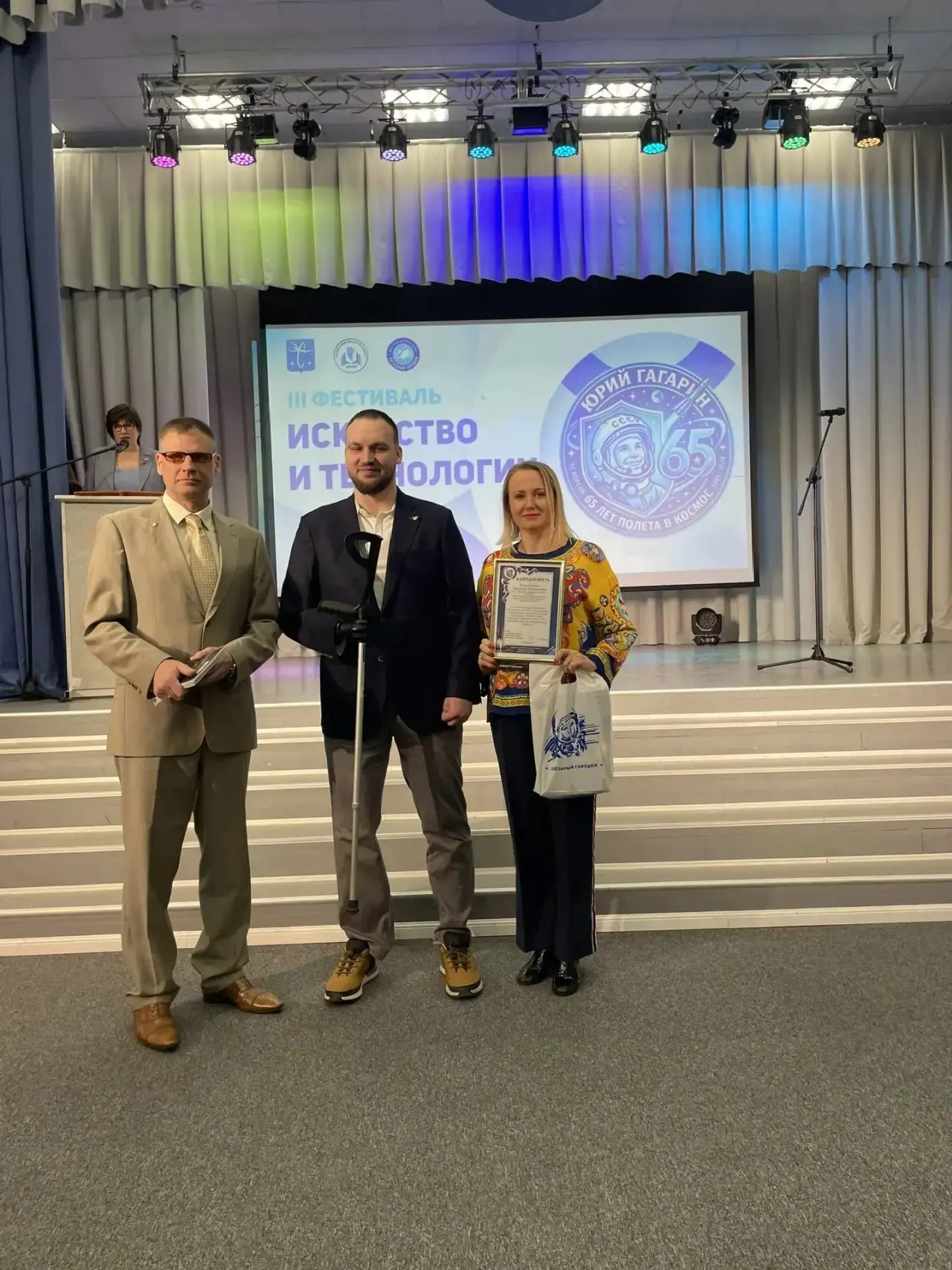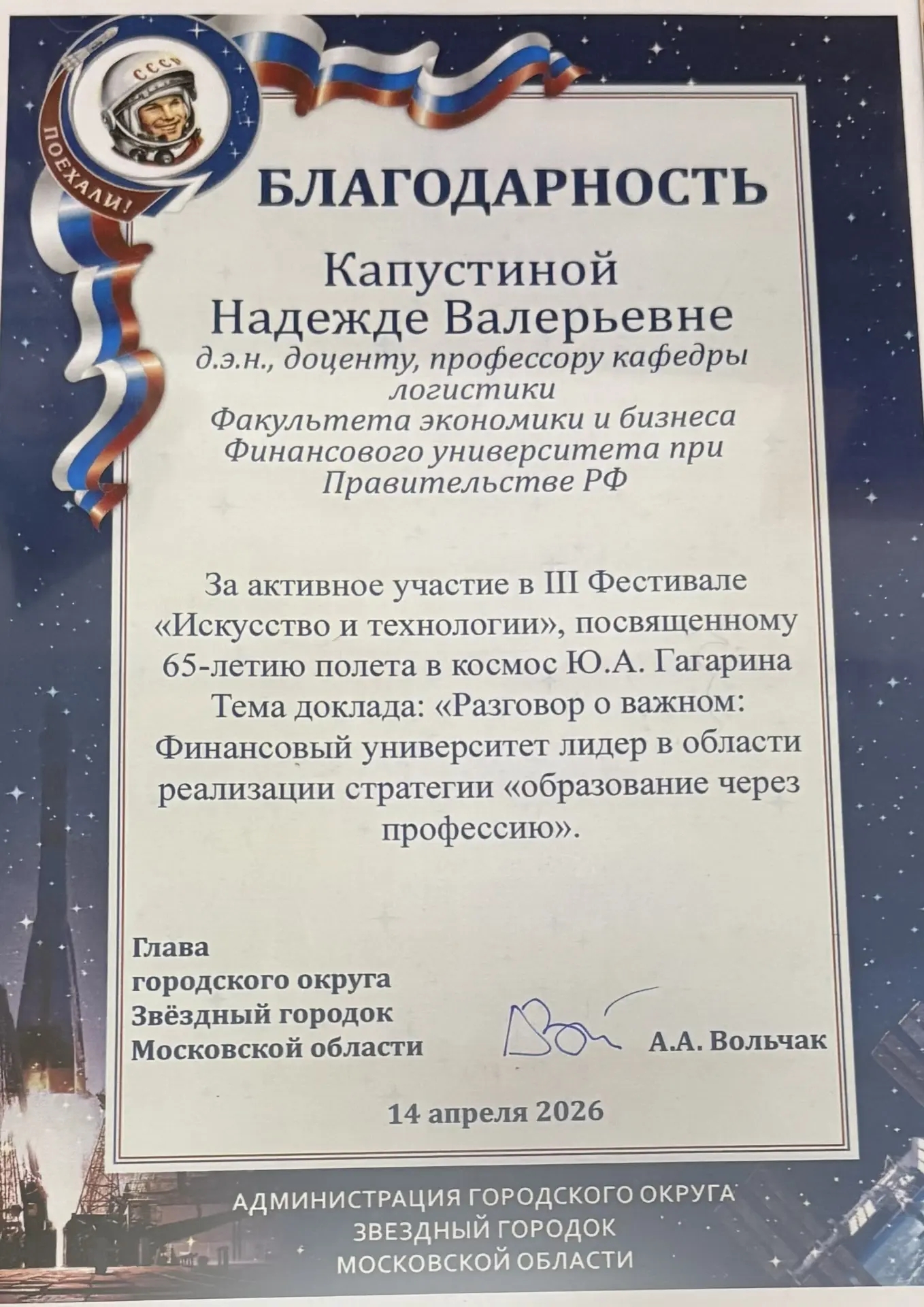 14 апреля 2026 года профессор Кафедры логистики Факультета экономики и бизнеса Капустина Надежда Валерьевна по приглашению АНО ДПО «Институт социально-экономического развития и человеческого капитала имени космонавта Валерия Федоровича Быковского» приняла участие в III Фестивале «Искусство и технологии», который прошёл на базе МБОУ СОШ имени В.М. Комарова в Звёздном городке, посвященное 65-летию полёта Юрия Гагарина.