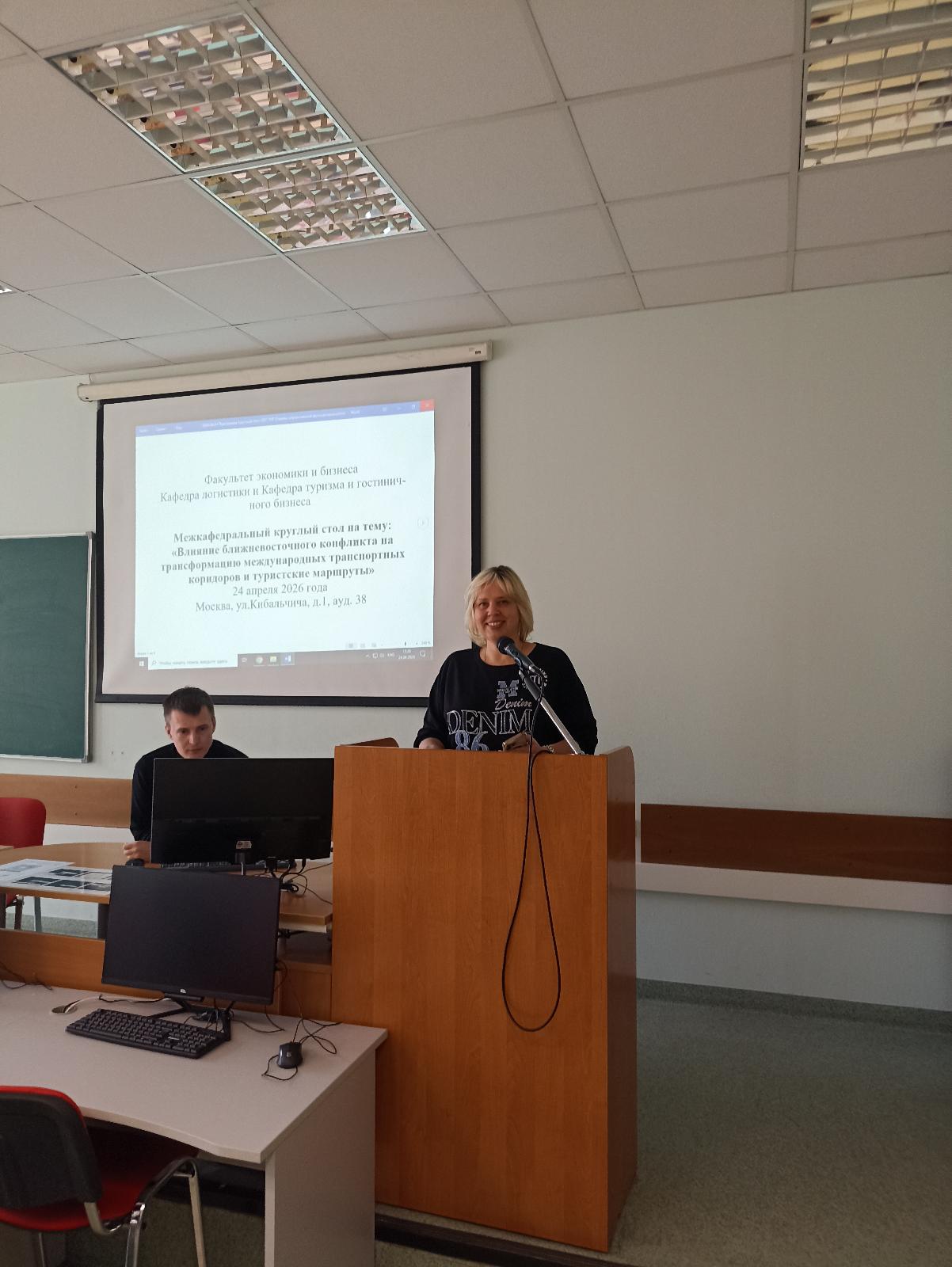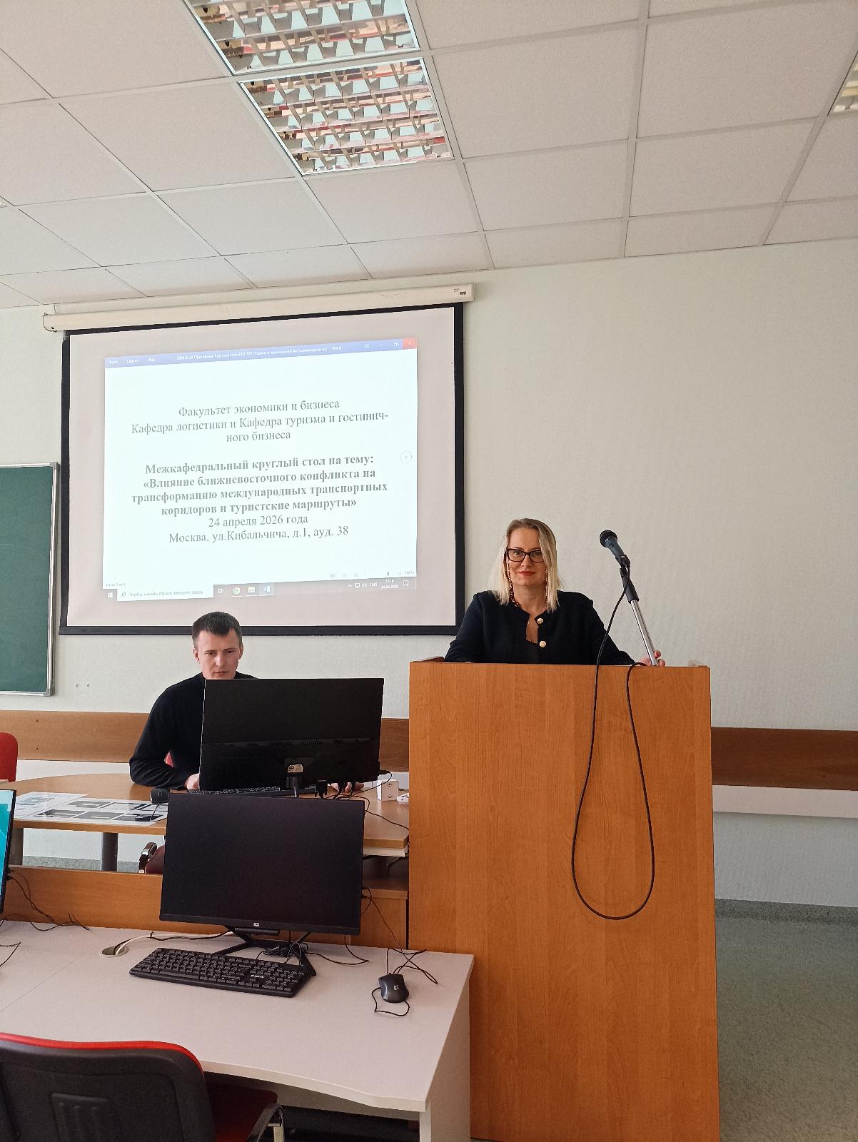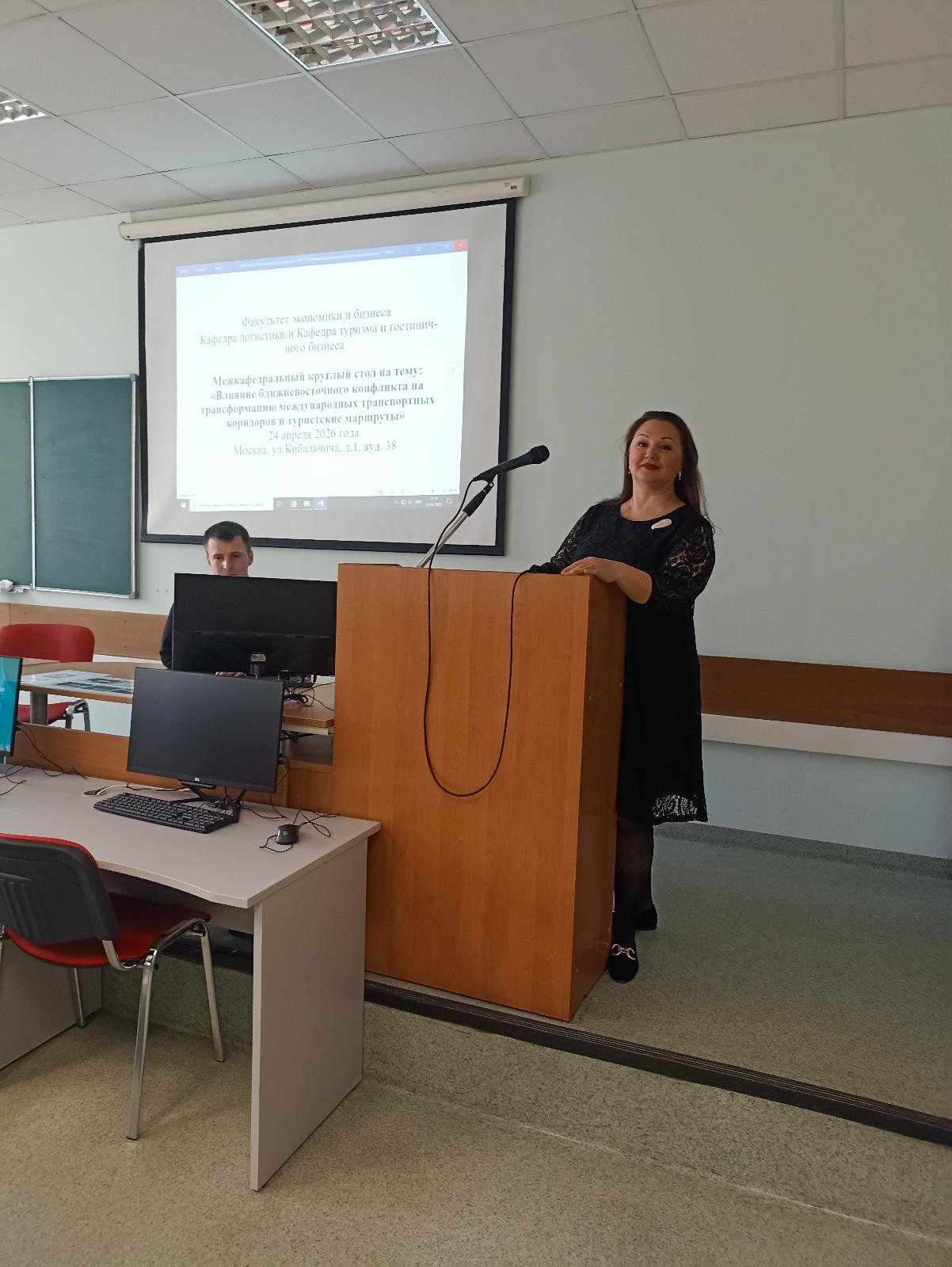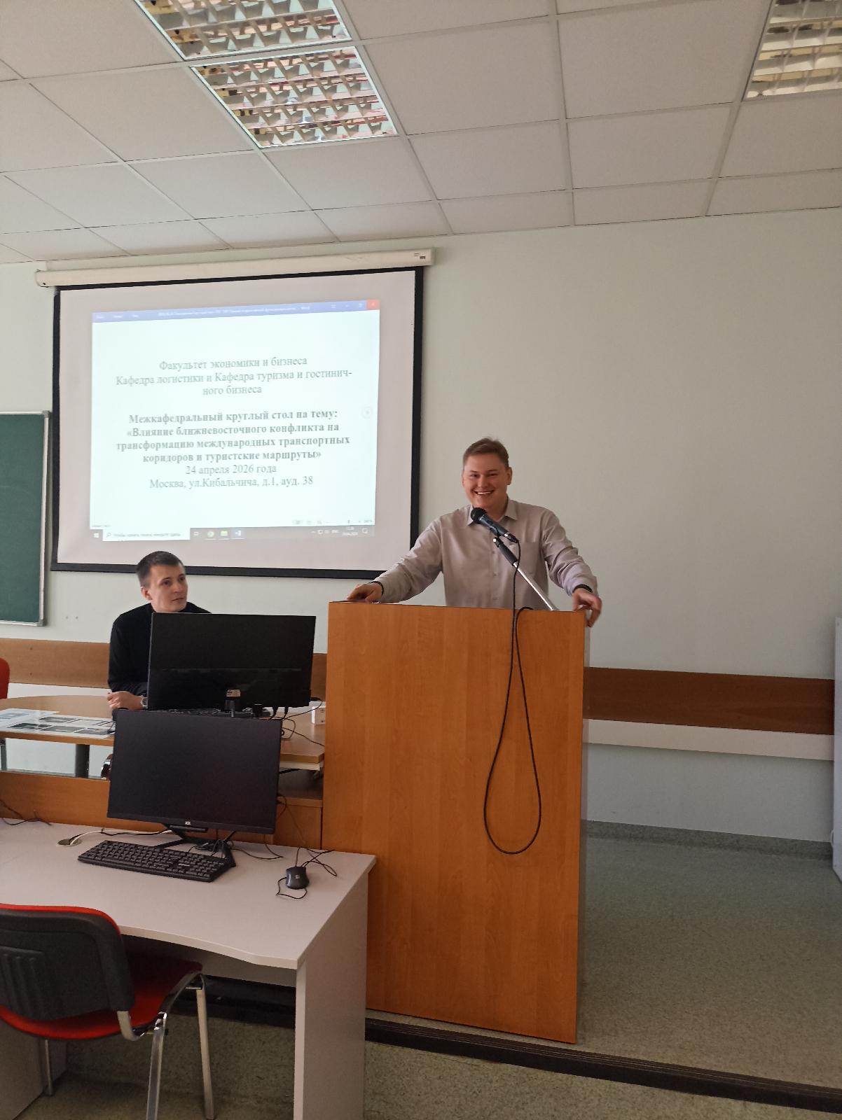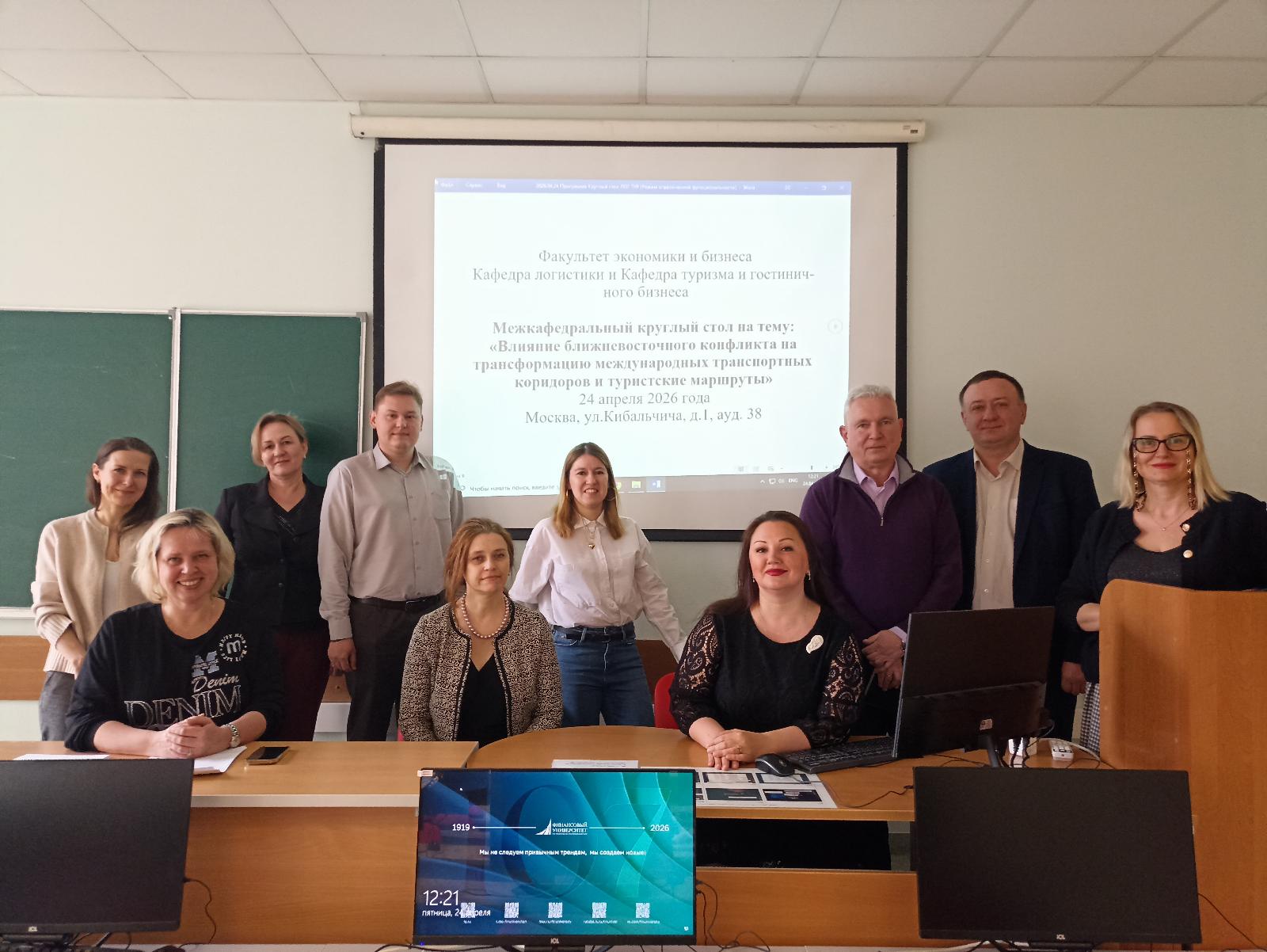 24 апреля 2026 года состоялся межкафедральный круглый стол «Влияние ближневосточного конфликта на трансформацию международных транспортных коридоров и туристские маршруты», организованный Кафедрой логистики и Кафедрой туризма и гостиничного бизнеса Факультета экономики и бизнеса. Открывали круглый стол с приветственным словом заведующий Кафедрой логистики Петров И.В. и заведующий Кафедрой туризма и гостиничного бизнеса Каганов В.Ш. Модератором встречи выступила доцент Кафедры логистики Жильцова О.Н.