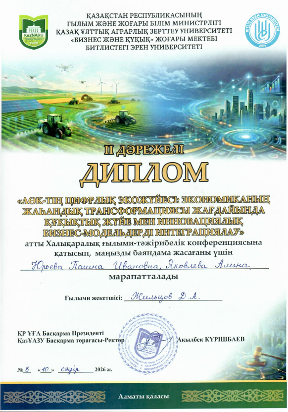 10 апреля 2026 года студенты группы ДПМиА25-1м Юрьева Полина и Яковлева Алина под руководством доцента Кафедры логистики Д.А. Жильцова приняли участие с докладом «Влияние цифровых каналов коммуникации на потребительское поведение в условиях развития цифровой экономики» в Международной научно-практической конференции «Цифровая экосистема АПК: интеграция правовой системы и инновационных бизнес-моделей в условиях глобальной трансформации экономики», которую организовали Высшая школы бизнеса и права Казахского национального аграрного исследовательского университета (Республика Казахстан, г. Алматы) и Университет Эрен (Турция, г. Битлис). По итогам участия был проведен конкурс на лучший студенческий доклад, в котором студенты группы ДПМиА25-1м Юрьева Полина и Яковлева Алина завоевали Диплом II место! Поздравляем наших дорогих студентов со столь высокой оценкой их научной работы и желаем свершений в будущем!
