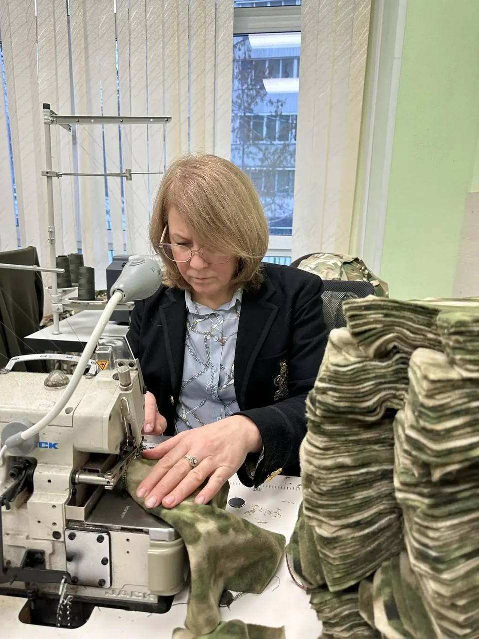 Екатерина Рэмовна Безсмертная - декан Факультета экономики и бизнеса и студенты присоединились к работе швейного цеха, организованного на площадке Юридического факультета. Участие представителей академического сообщества в данном проекте подчеркивает единство и гражданскую солидарность университета, направленные на оказание всесторонней помощи военнослужащим СВО.