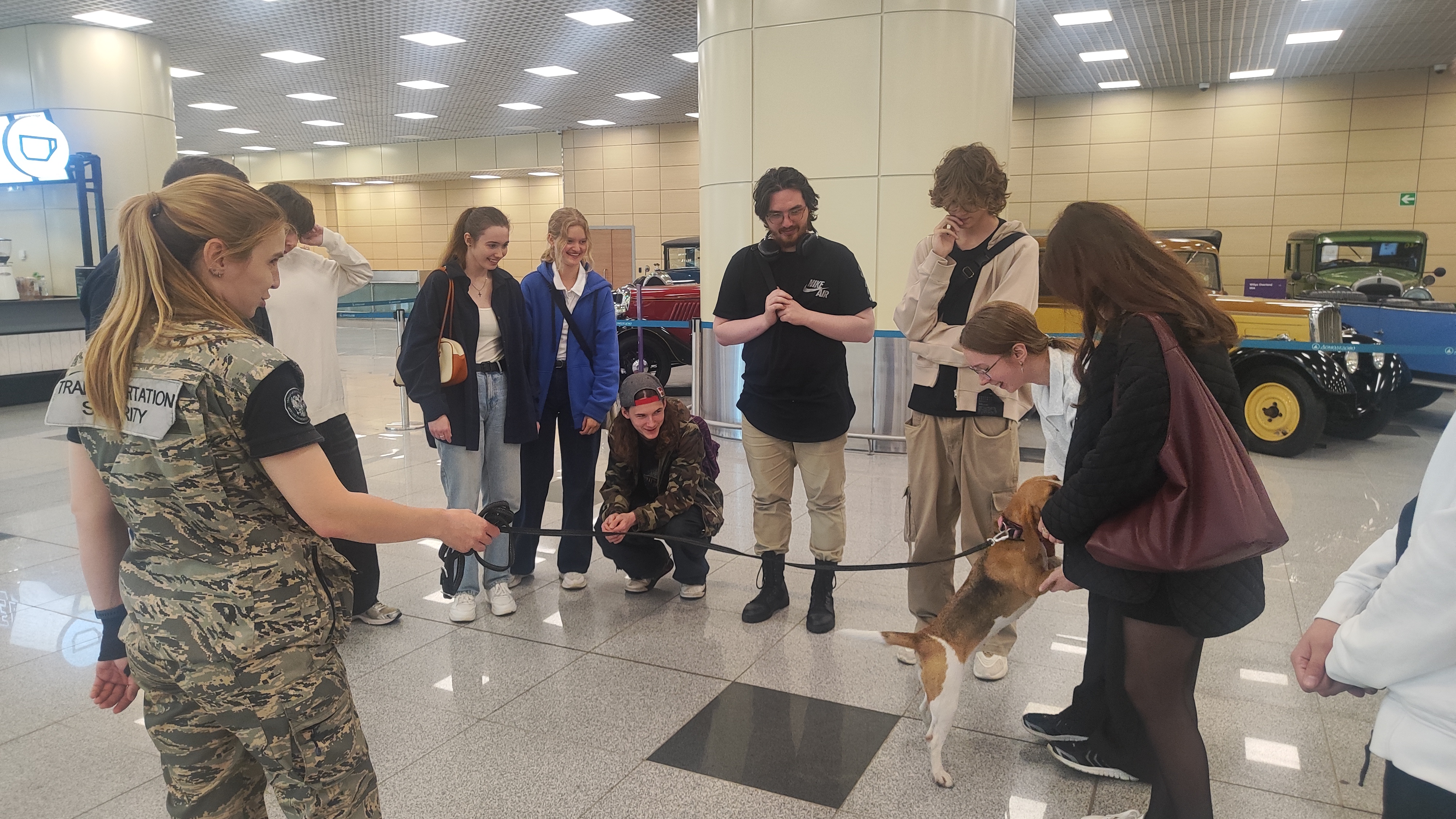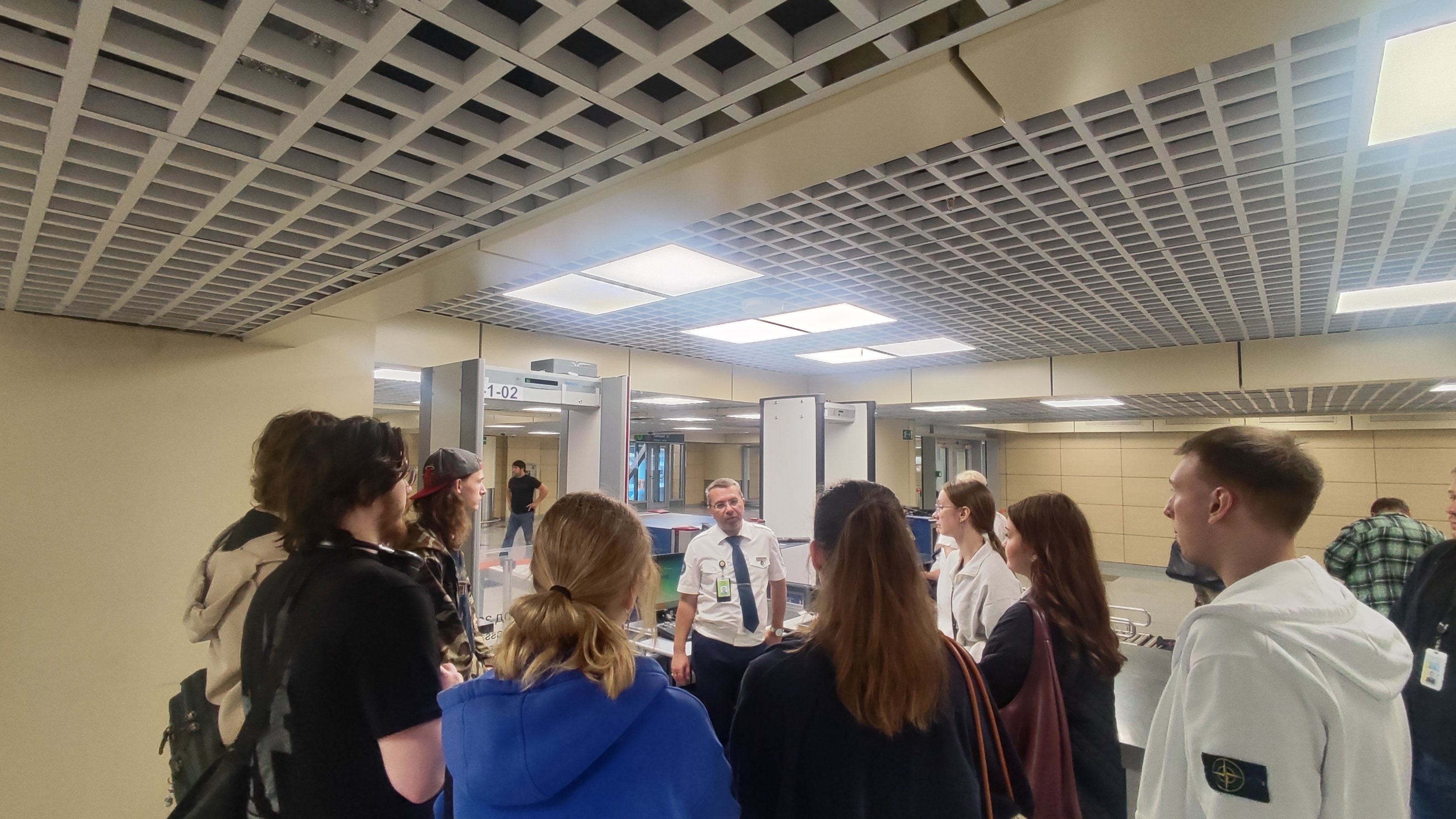 В ходе экскурсии ребятам рассказали историю возникновения аэропорта, принципы работы табло аэропорта, какие объекты входят в аэропортный комплекс, познакомили более подробно с работой трёх направлений деятельности: работой на стойках регистрации, сотрудников транспортной безопасности и кинологического отдела. Сотрудник отдела регистрации рассказала секреты рассадки пассажиров и требований к провозу багажа, особенности работы с различными авиакомпаниями. В ходе знакомства с работой отдела транспортной безопасности студенты наглядно смогли увидеть, как выглядят запрещённые к проносу на территорию аэропорта объекты, какие признаки указывают на потенциальную опасность и как используется оборудование досмотра. В завершении экскурсии сотрудники аэропорта рассказали об орнитологической и кинологической службах. С ястребами, находящимися на службе, к сожалению, не удалось познакомиться лично, но один из доброжелательных хвостатых сотрудников всё-таки был представлен публике.