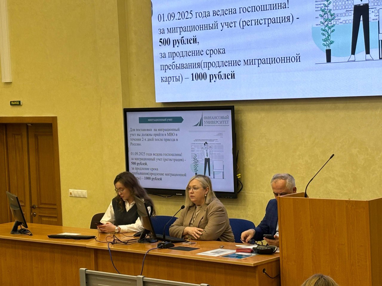 Мазур Пётр Тимофеевич, начальник миграционно-визового отдела, и Харитонова Наталья Валентиновна, главный специалист, дали подробные разъяснения по миграционному законодательству, срокам и процедурам оформления необходимых документов, ответив на многочисленные вопросы студентов.