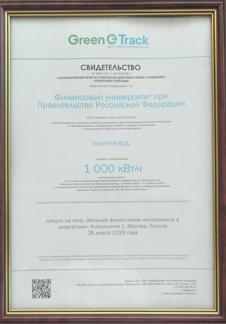 26 марта 2026 г. в Финансовом университете при Правительстве РФ состоялся Мастер-класс для студентов магистерской программы "Экономика и моделирование бизнес-процессов топливно-энергетического комплекса" на тему «Зелёные финансовые инструменты в энергетике». В ходе мероприятия магистранты узнали о специфике и значении Зелёных сертификатов как финансового инструмента, о формате их обращения, об инфраструктуре, которая обеспечивает их учёт. Спикер мероприятия – Опря Юлия Викторовна, заместитель директора АО «Энергосбыт» - рассказала о спросе на Зелёные сертификаты и значимости их для индикативного мониторинга популярности ЭКГ повестки среди участников экономических отношений.