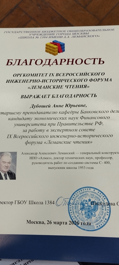26 марта 2026 года Анна Юрьевна Дубошей, кандидат экономических наук, старший преподаватель Кафедры банковского дела и монетарного регулирования приняла участие в качестве эксперта в секции 6 Девятого Всероссийского инженерно-исторического форума «Леманские чтения» - «Предпринимательский класс в Московской школе». Школьники из 10-П класса школы 1384 представили свои доклады, посвященные экономическому обоснованию социально значимых проектов. По результатам экспертизы три участника признаны победителями и три - призерами конкурса. На заключительном мероприятии Форума призерам и победителям и участникам были вручены Дипломы и памятные подарки.