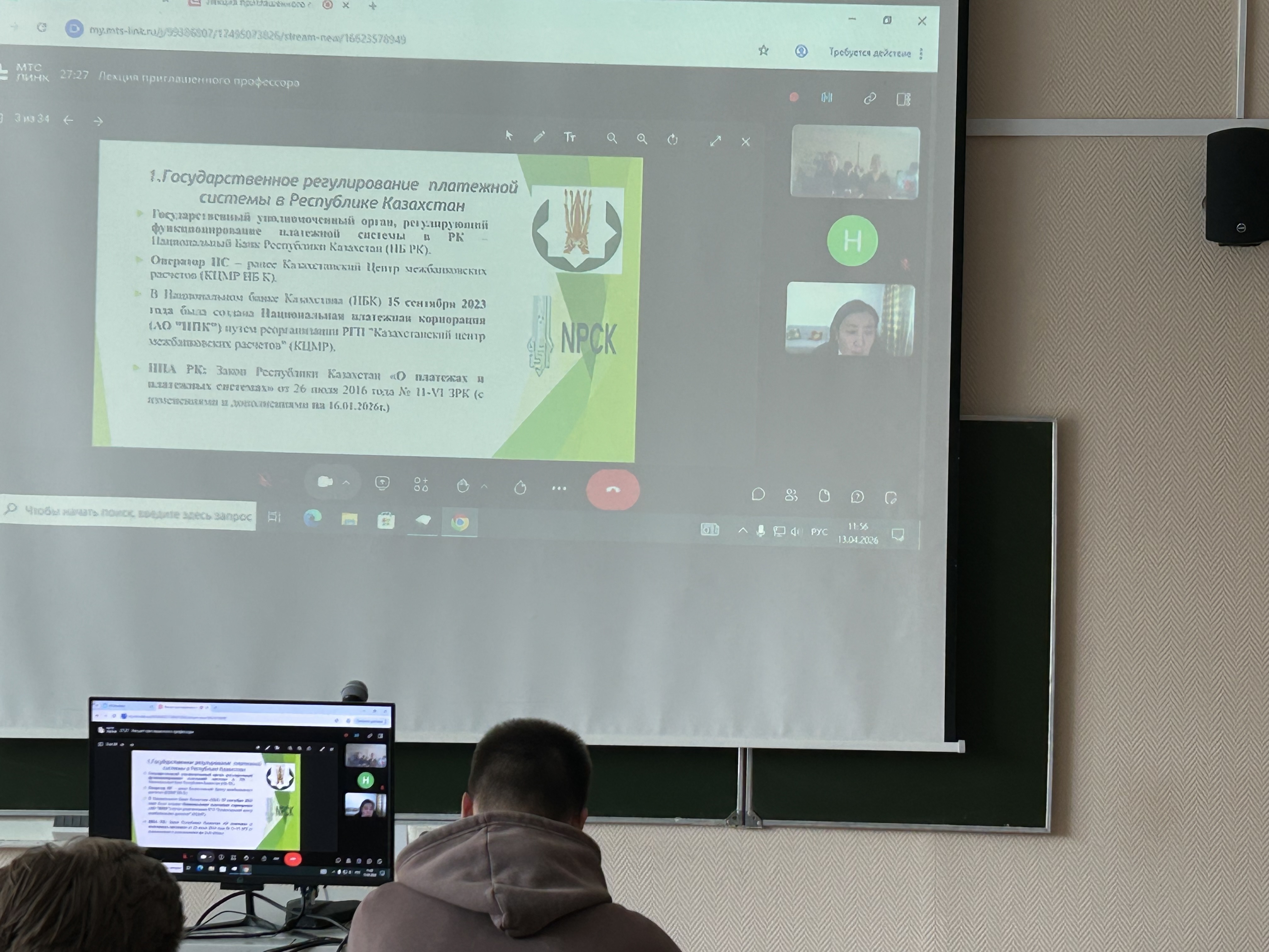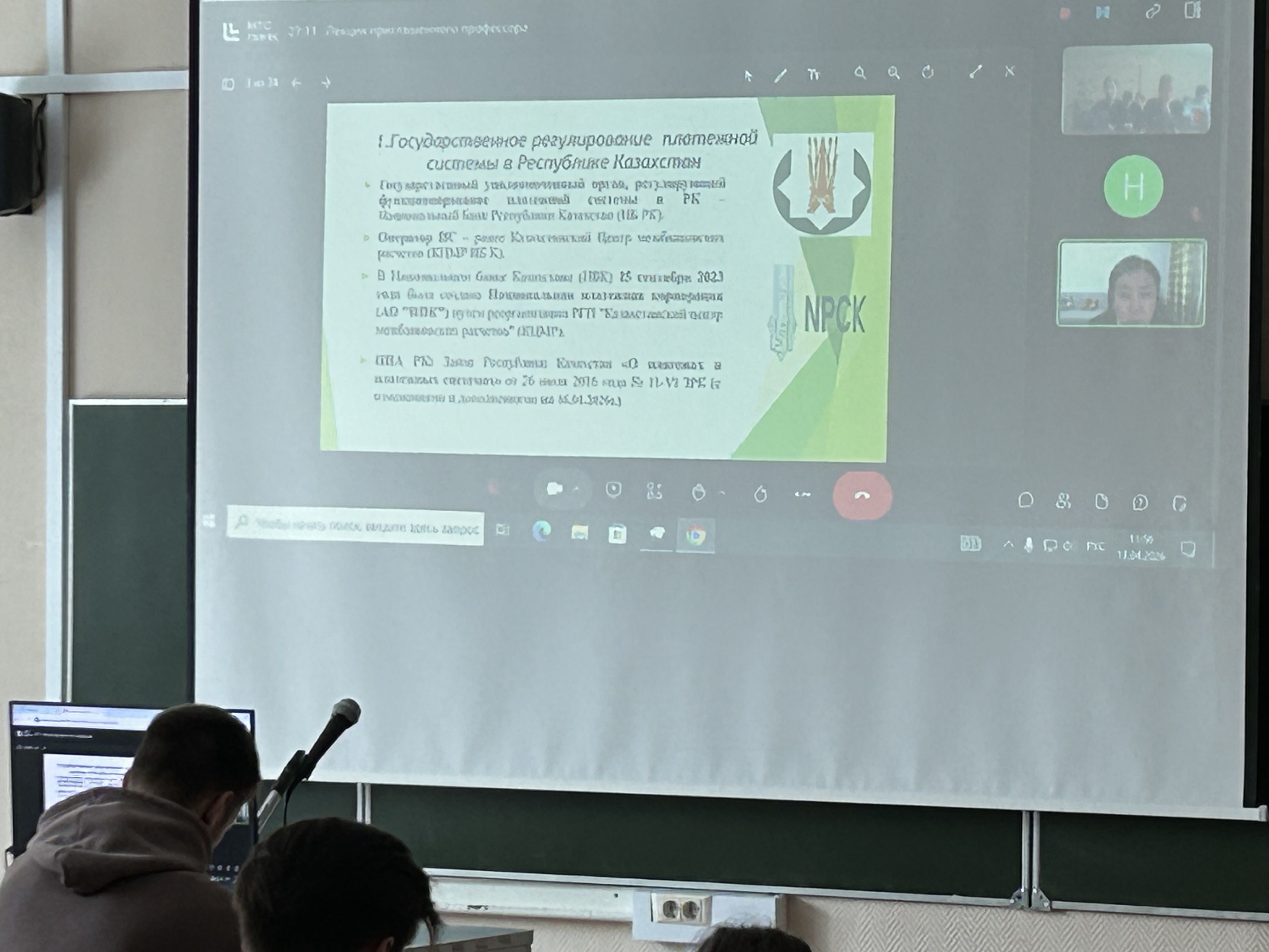 13 апреля 2026 г. в рамках программы «Приглашенный профессор» прошла лекция к.э.н. Есымхановой Зейнегуль Клышбековны, профессора кафедры «Финансы» факультета «Бизнес и управление» ESIL University (г. Астана, Казахстан) на тему «Цифровые активы в платежной системе Республики Казахстан». Цель - изучение практики Казахстана в сфере технологий функционирования платежных систем в условиях цифровизации.