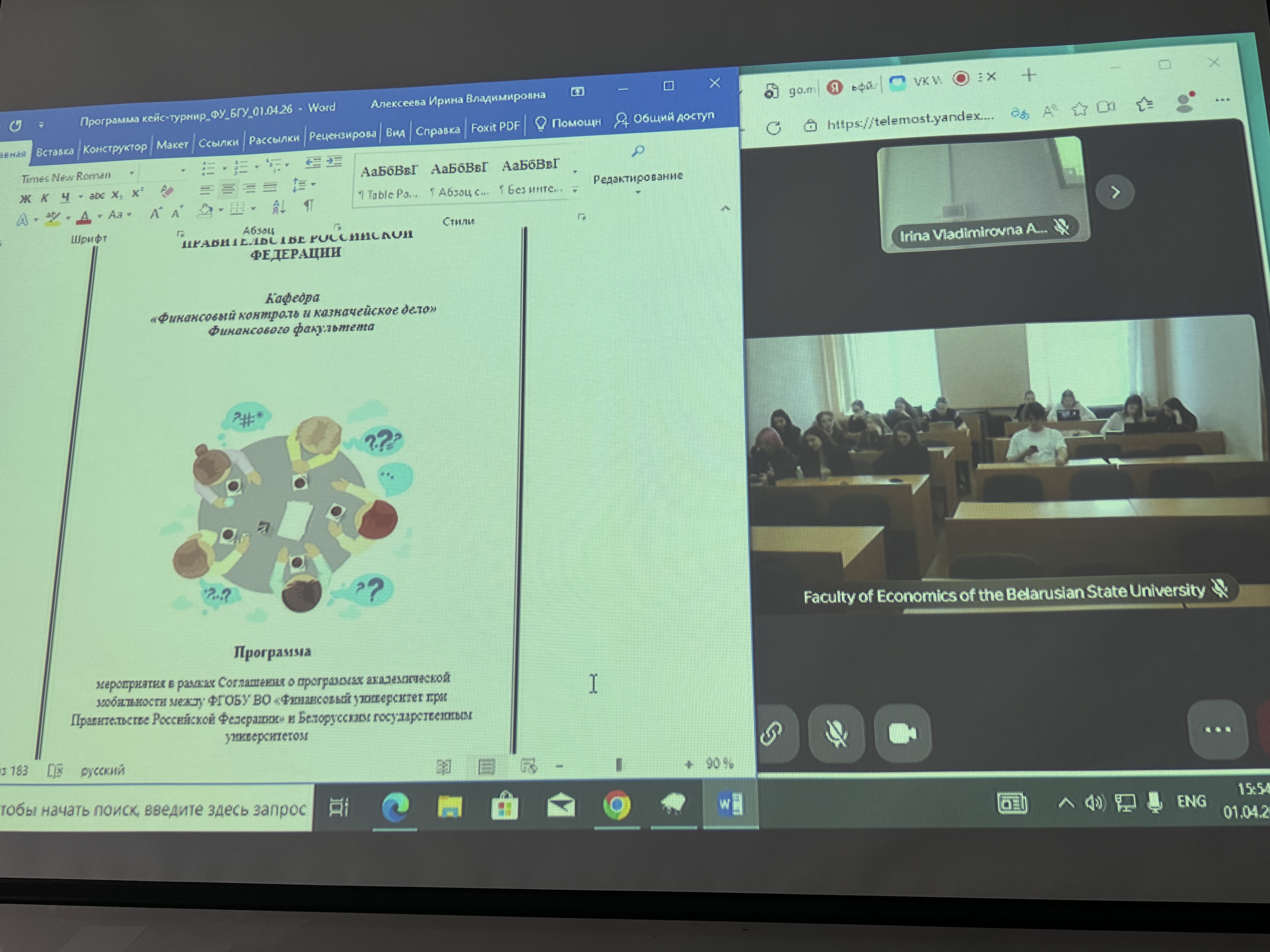 В рамках празднования Дня единения народов России и Белоруссии, а также развитии Соглашения о программах академической мобильности между ФГОБУ ВО «Финансовый университет при Правительстве Российской Федерации» и Белорусским государственным университетом 01.04.26 года был проведен кейс-турнир на тему «Доказательные подходы к реализации контрольных мероприятий и их достаточность в суде».