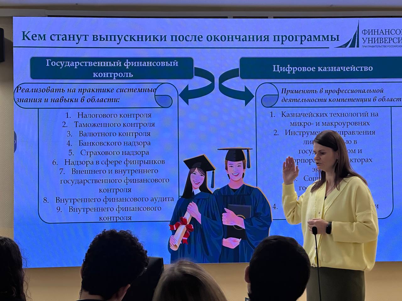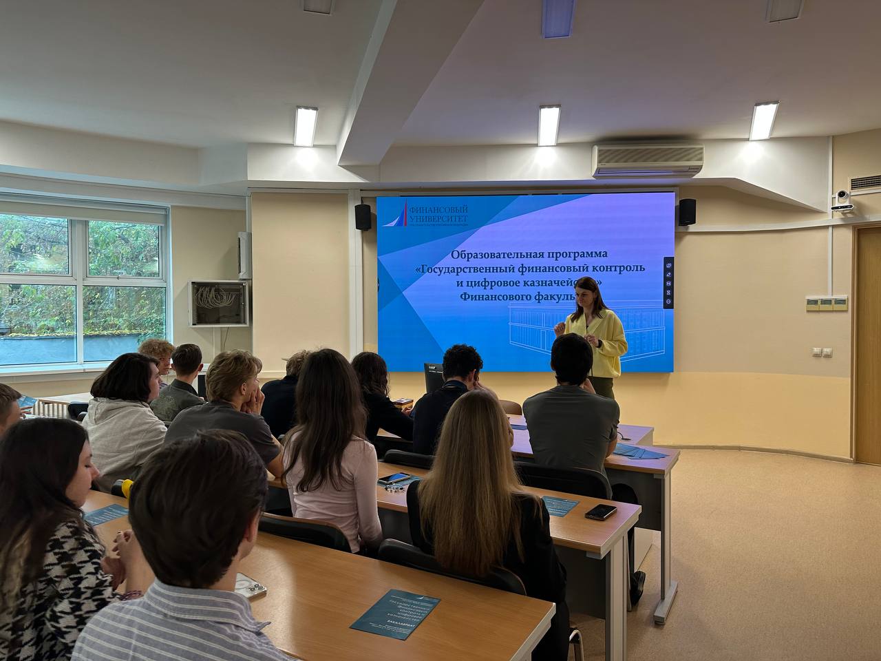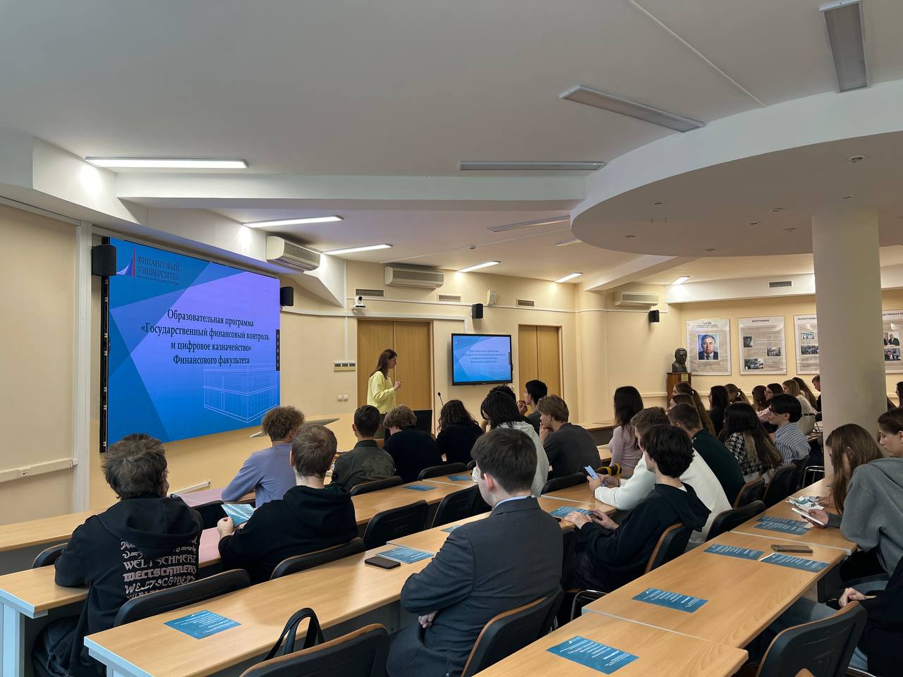 17 октября 2025 года в стенах Финансового факультета кафедра «Финансовый контроль и казначейское дело» провела профориентационное мероприятие для учащихся 11-го класса Лицея Финансового университета при Правительстве Российской Федерации. Представители кафедры презентовали инновационную образовательную программу бакалавриата «Государственный финансовый контроль и цифровое казначейство», а также провели научно-практическую викторину «Финтех в госсекторе: от автоматизации